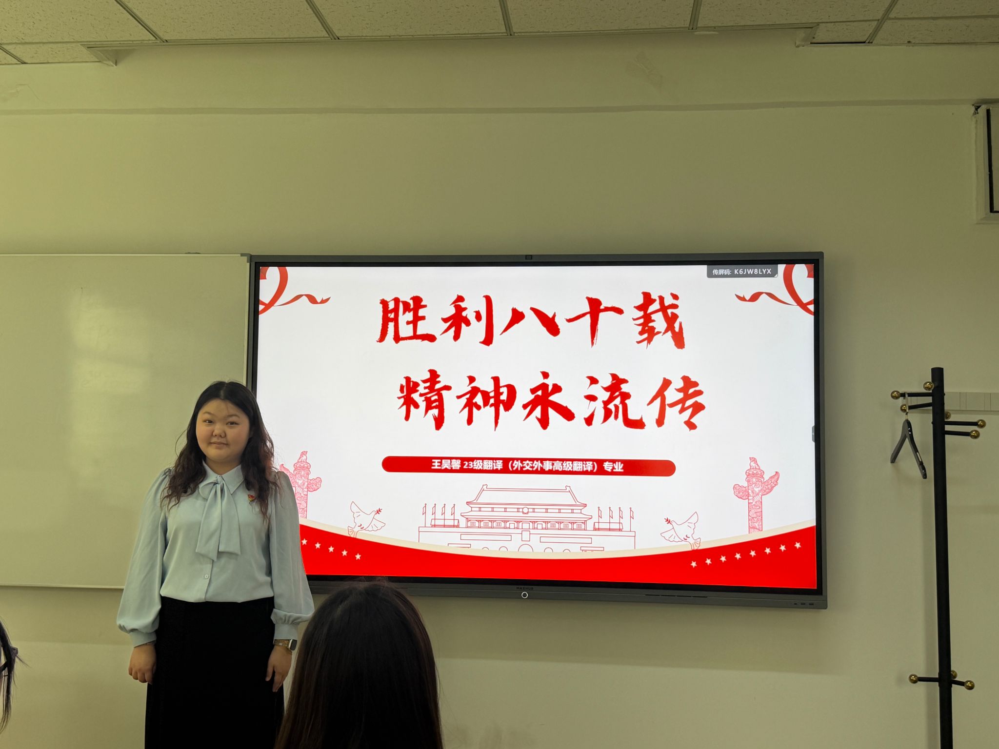 10月12日,系列活动在校园内继续开展。团总支特邀参加“九三阅兵”的中国人民解放军某部队中校参谋拱彦硕及公司曾参与“九三阅兵”志愿服务的2023级本科生王昊馨进行分享。拱彦硕参谋结合自身参加2019年和今年两次阅兵工作的经历,生动讲述了阅兵训练与筹备背后的细节,指出“‘保家卫国’从不是一句口号,而是党和人民赋予的使命;这份担当,与青年‘强国复兴有我’的追求高度契合。”王昊馨谈到:“能够运用专业能力服务阅兵活动,是践行北外‘语言报国’精神的生动体现,更是落实‘请党放心,强国有我’青春誓言的实践行动。”团员代表李依静、朱馨莹先后发言,表示将以使命感深耕外语专业、把个人理想融入党和国家事业。