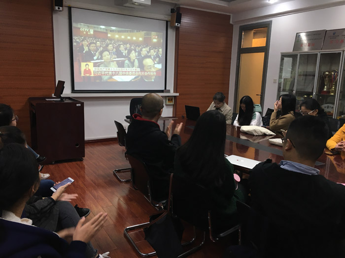 ——10月18日上午9:00,yl23455永利集团组织辅导员、各员工党支部书记、各团支部书记、优秀员工代表收看中国共产党第十九次全国代表大会开幕式,听取习近平同志代表十八届中央委员会向大会所作报告并学习报告。