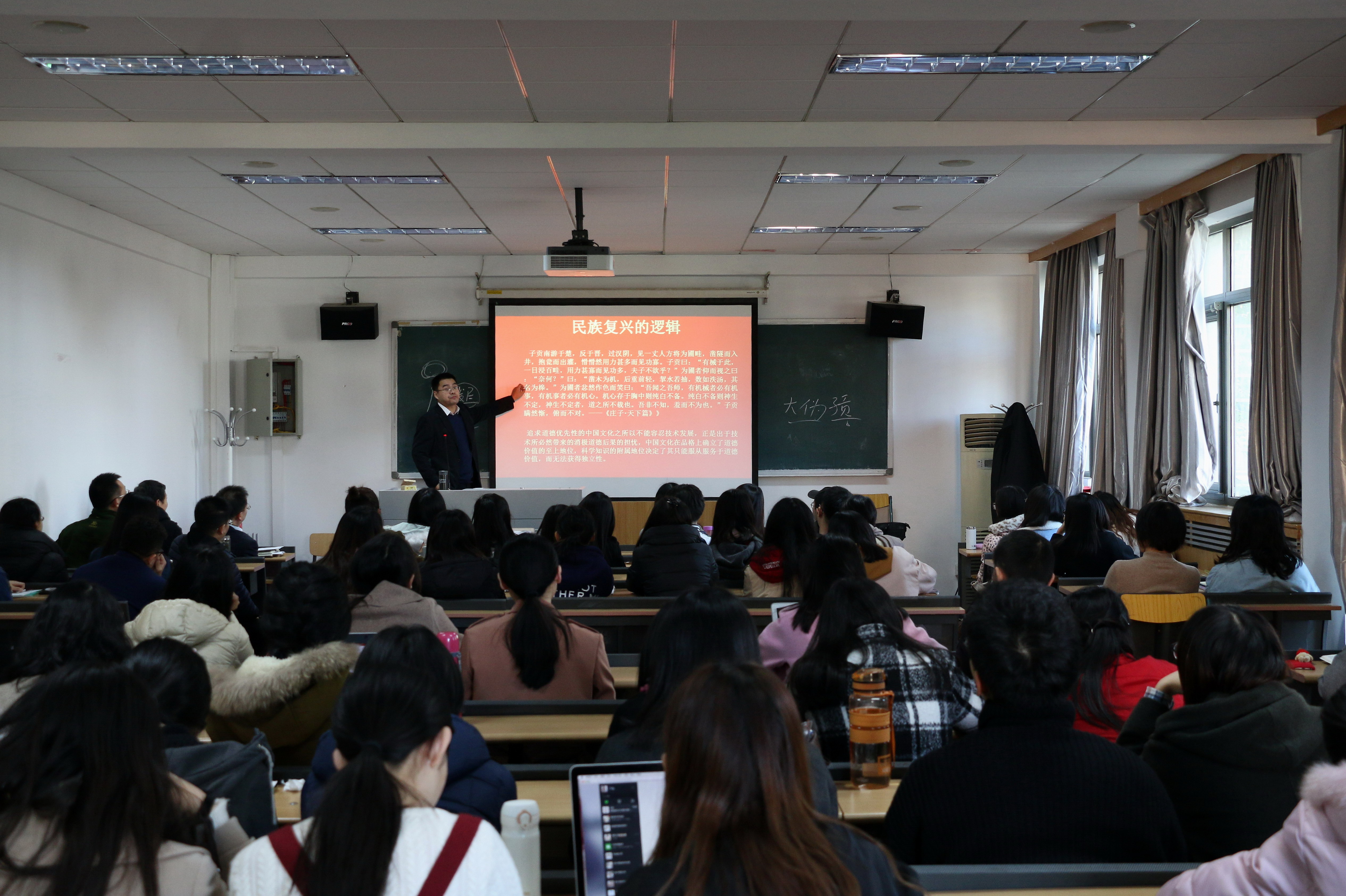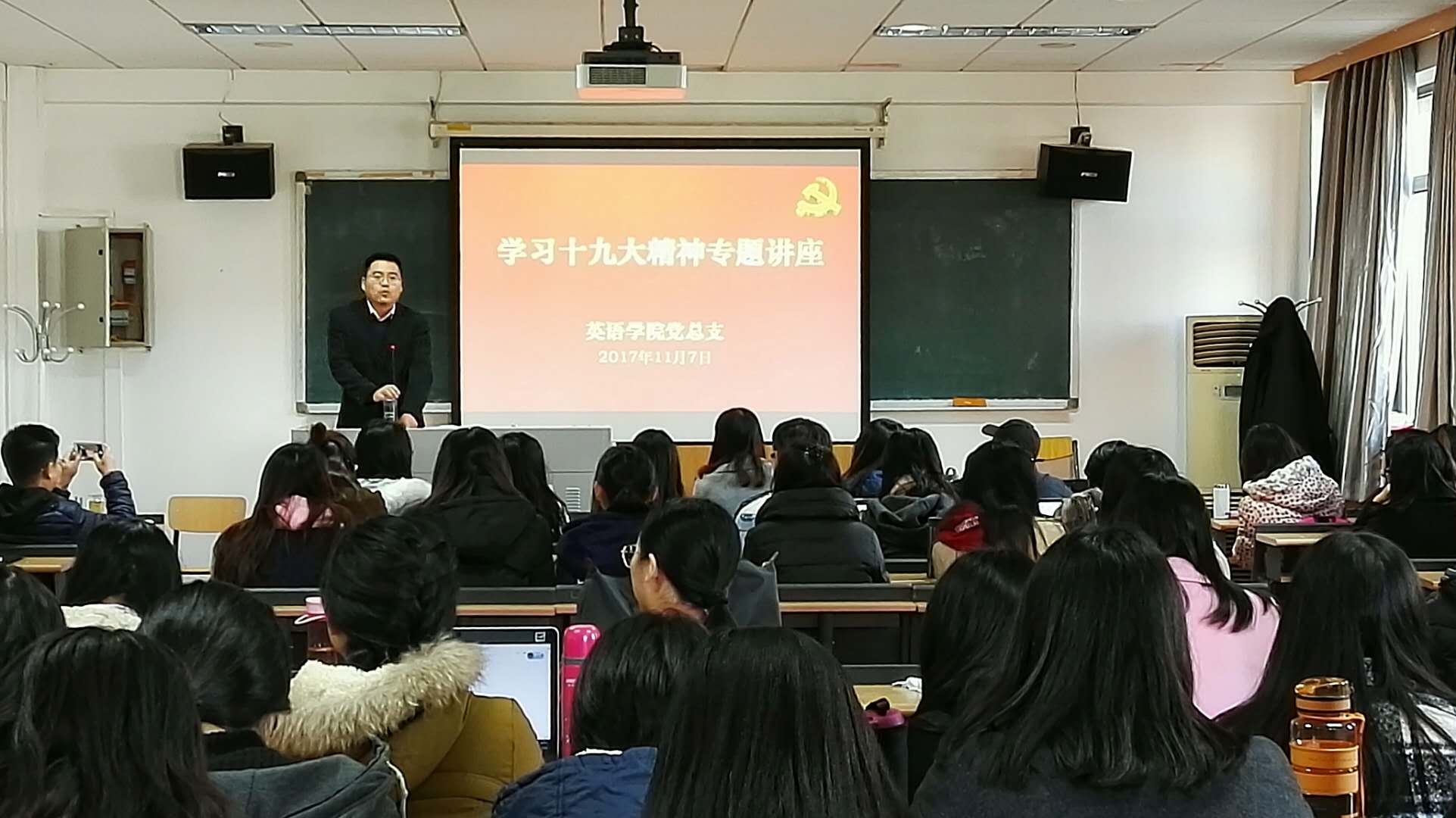 ——讲座由党总支书记路兴主持,yl23455永利集团近100名师生党员到场聆听讲座。