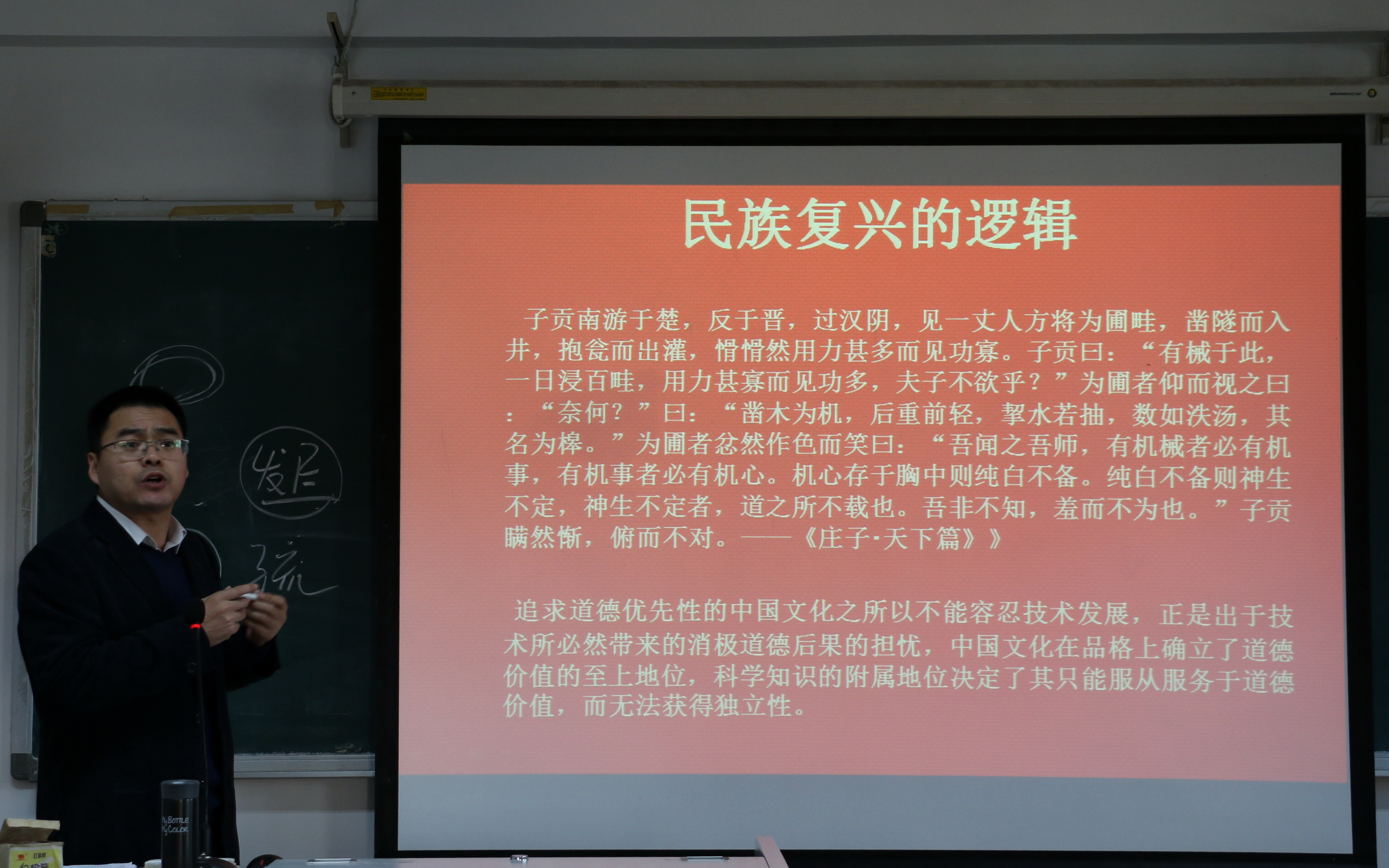 ——祝和军从历史唯物主义的角度,以“党的十九大报告中的三个‘意味’看中国社会发展的三重逻辑”为题,就十九大报告中蕴含的民族复兴的逻辑、社会主义逻辑及现代化逻辑做了深入浅出的阐释和解读。他认为,民族复兴是贯穿于十九大报告的主逻辑,中国共产党人的初心和使命,就是为中国人民谋幸福,为中华民族谋复兴;社会主义逻辑就是在马克思主义指导这个问题上既克服了教条主义的危害,也克服了经验主义的束缚,始终保持了与时代的对话姿态,贴近了实践,扎根于人民,科学社会主义在二十一世纪的中国才焕发出强大的生机活力。习近平新时代中国特色社会主义思想作为新时代我们党的指导思想,正是随着历史条件的变化,新的历史起点的确立,运用马克思主义的立场观点和方法对中国社会新时代进行思考的思想结晶。现代化逻辑是指中国社会在中国共产党的领导下,打破了西方中心论的神话,实现了对闭关锁国、因循守旧的保守姿态和完全照搬西方现代化模式的激进姿态的双重超越,在马克思主义的指导下走出了一条独特的社会主义现代化之路。