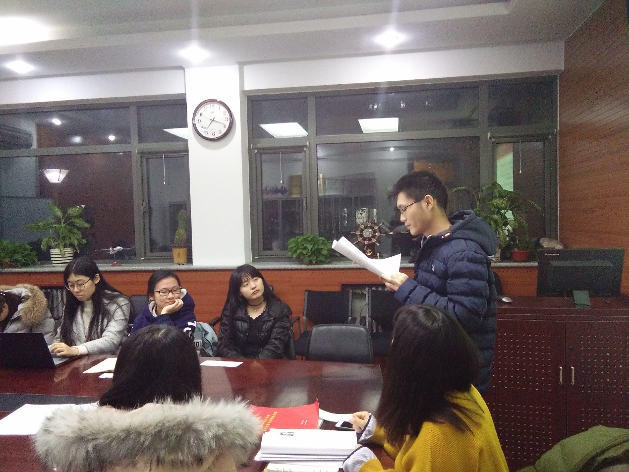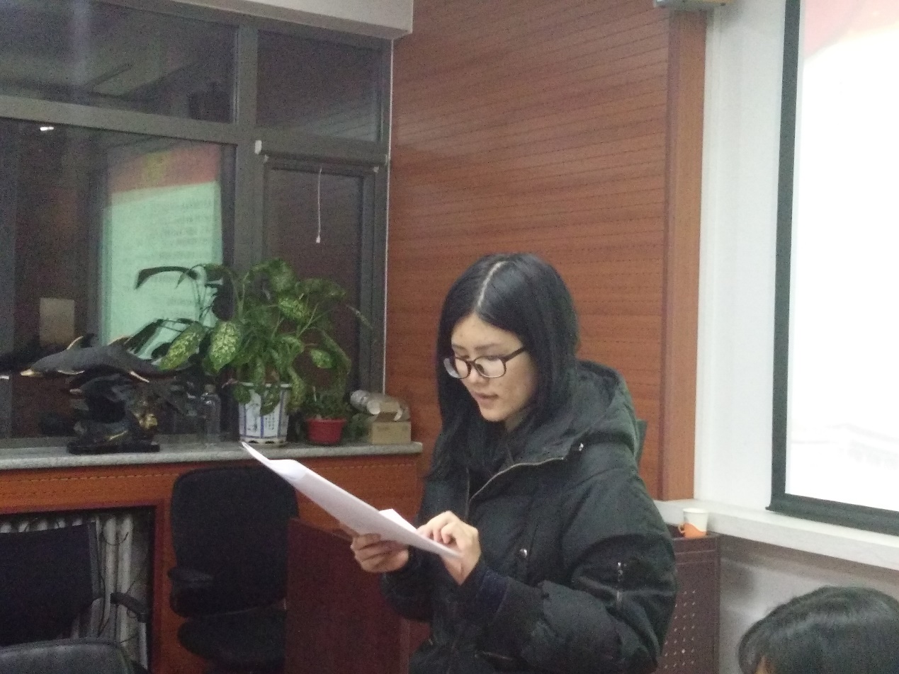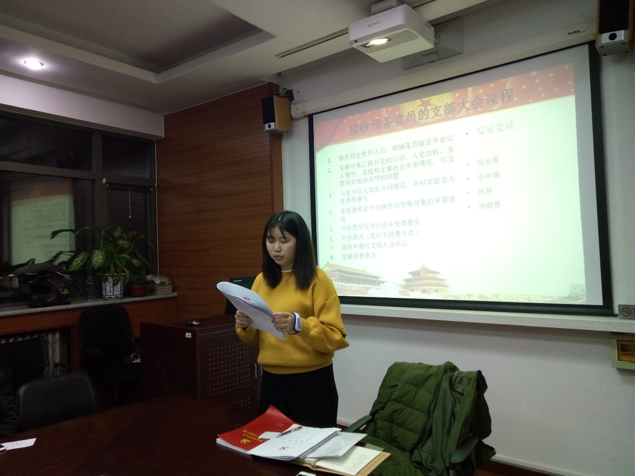 ——会议伊始,党支部书记卢兴苗同志表示经过长时间的考察,今天终于迎来了接收四位同志为预备党员的大会,随后宣布会议正式开始。首先,2016级语言学硕士研究生吕永周同志宣读自己的入党志愿书;接着其入党介绍人卢兴苗同志、杨婷同志发表意见,表示吕永周同志积极学习党的知识,学习刻苦,群众基础良好,同意推荐其入党;纪检委员宋志远同志报告了对吕永周同志的政治审查情况;接下来与会党员发表意见;最后与会党员进行无记名投票表决。随后,2016级语言学硕士研究生汪中瑞同志、2015级语言学硕士研究生张妍同志、2016级语言学硕士研究生徐碧蓉同志按照上述程序依次进行汇报。汇报结束后,收集与会党员投票结果,纪检委员为计票人,组织委员为监票人,经统计,党支部决定接收吕永周同志、汪中瑞同志、张妍同志和徐碧蓉同志为中国共产党预备党员。