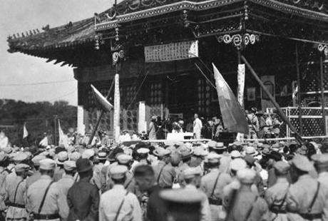 图二:1933年7月7日至12日吉鸿昌将军率领察哈尔抗日同盟军收复多伦后在山西会馆内的大戏台召集群众大会并发表抗日宣传演讲。