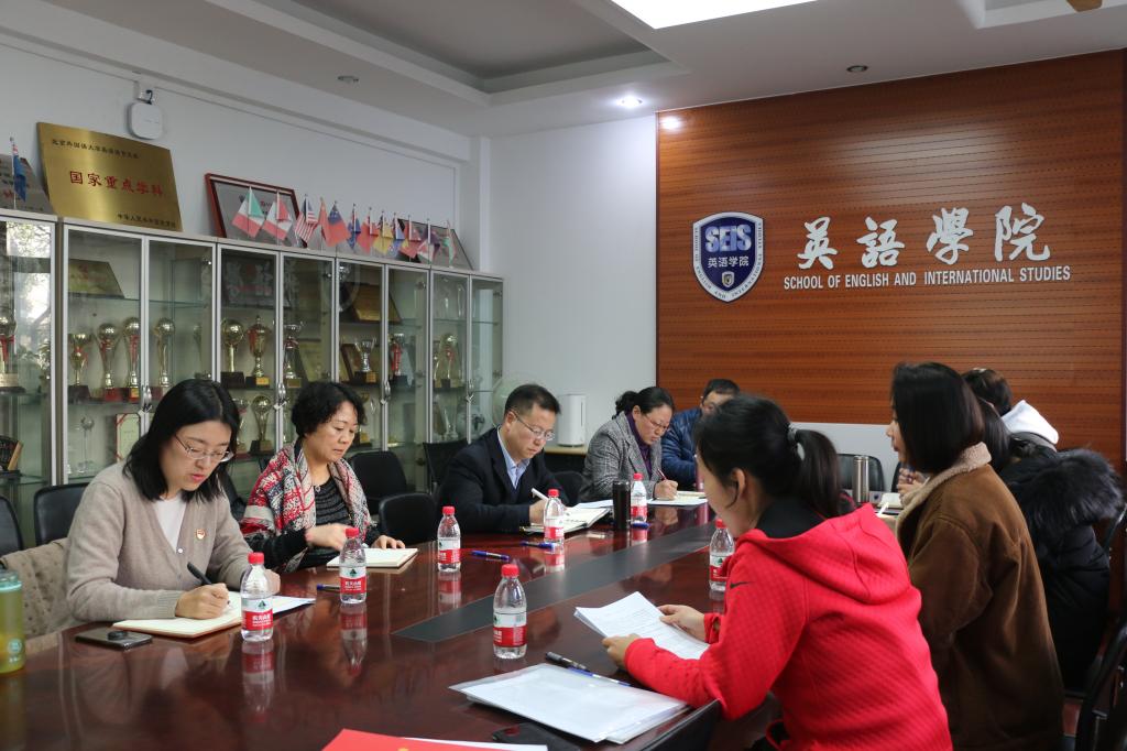 会议开始,根据学校主题教育领导小组办公室评估督导组的的安排,全体党员现场填写了《北京外国语大学“不忘初心,牢记使命”主题教育终期学习效果评估问卷》。随后,王欣扬针对组织开展主题教育、严格党员教育管理、联系服务群众、改进工作作风这四个方面进行了党支部问题检视与主要整改措施的汇报。她表示,虽然本学期党支部组织了多次活动,但是对于落实到个人的学习计划还有欠缺,理论学习还不够循序渐进;党支部对党员教育管理认识有偏差,教育培训缺乏新意,形式单一;党支部活动经常仅局限于行政人员,并且存在因循守旧、按部就班的思想。王欣扬同时提出了:制定党员个人学习计划;多方式开展谈心谈话;邀请其他支部党员和教师参与支部活动;工作要有创新与担当的几点要求与整改措施。在全体党员个人对照检查环节,支部党员按照顺序开展了批评与自我批评,大家本着对同志高度负责的态度,敞开心扉、坦诚相见,实事求是地查找不足与问题。随后,党支部进行了民主测评党支部与党员自评、互评环节。