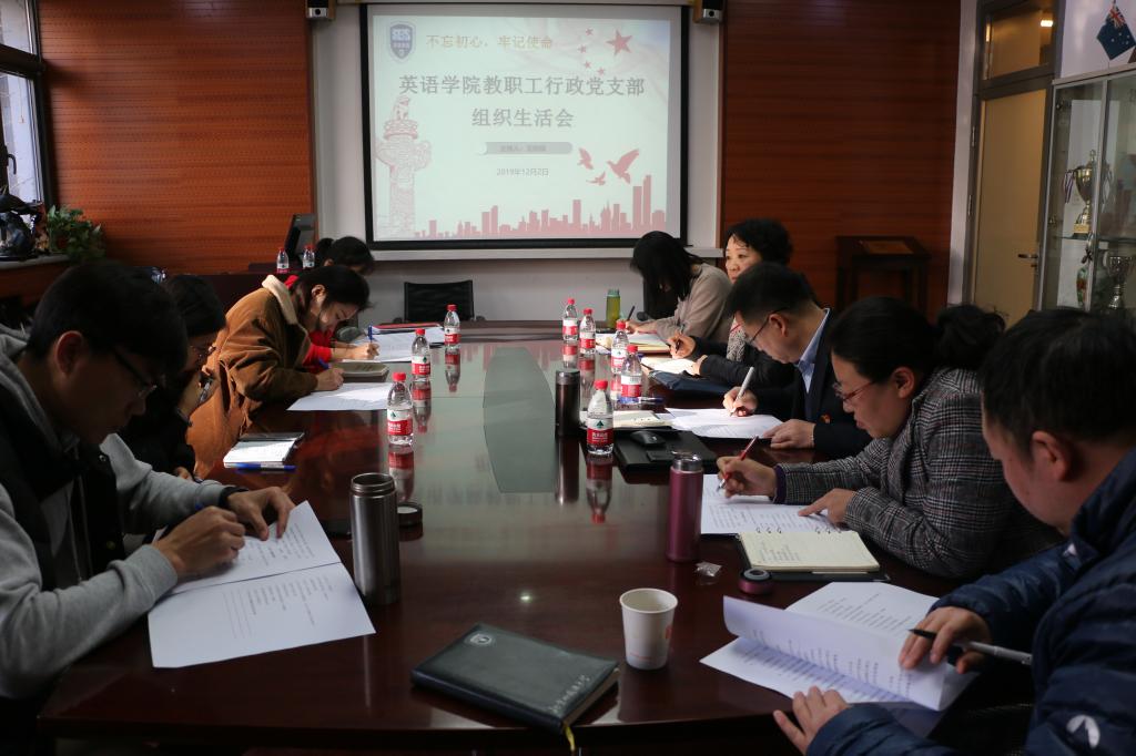 2019年12月2日下午,为深入学习贯彻习近平总书记关于“不忘初心、牢记使命”主题教育重要讲话和重要指示批示精神,yl23455永利集团教职工行政党支部全员在115会议室召开组织生活会。学校主题教育领导小组办公室评估督导组成员、后勤党总支书记潘华珍老师莅临指导。