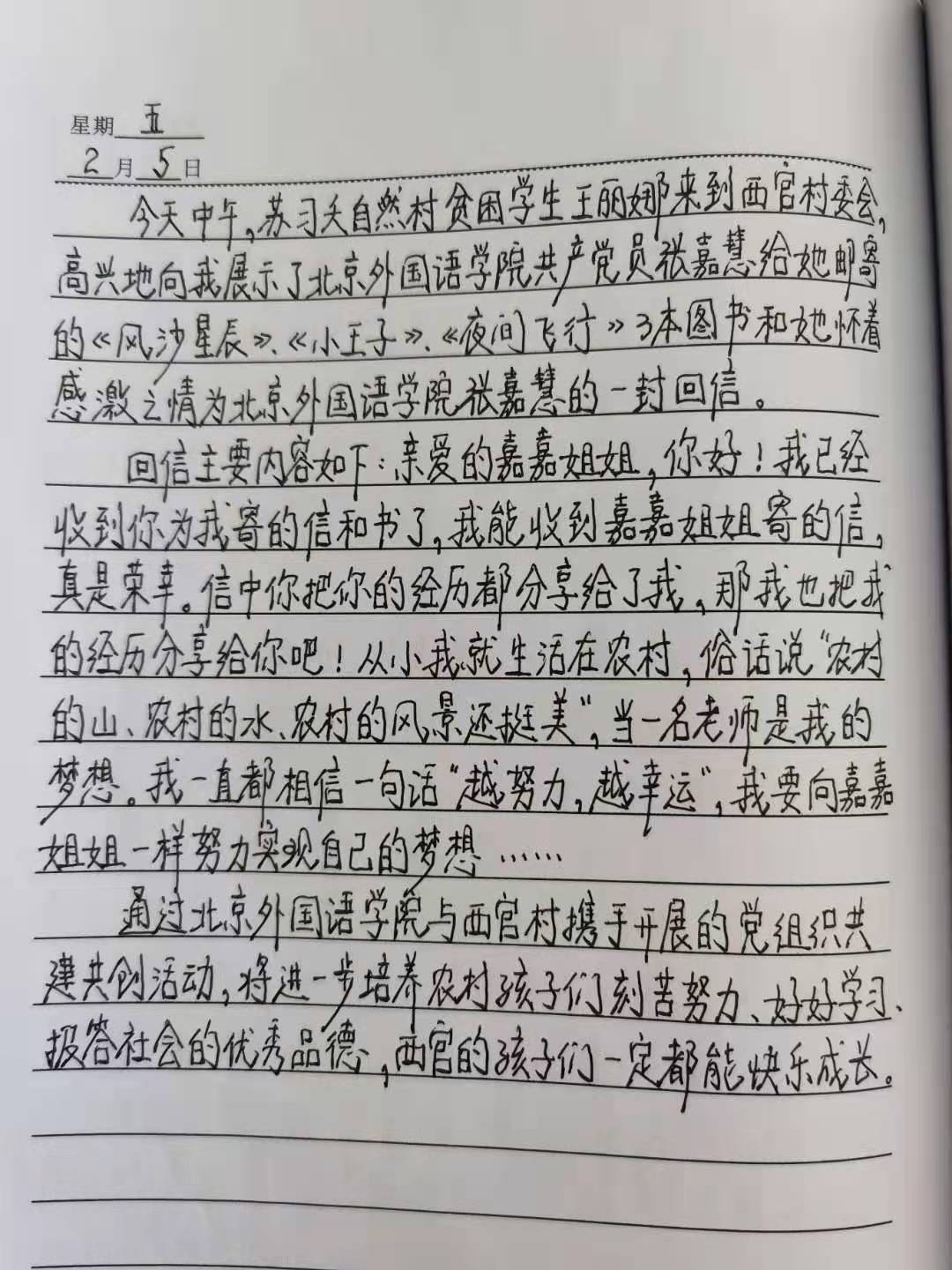 兴和县曾经是国家级贫困县,已经于2020年初实现脱贫摘帽。本次社会实践活动为兴和县的孩子们带去书籍与知识,孩子们也在给哥哥姐姐的回信中表达了自己收到书信的喜悦和对于未来的憧憬。本科生党支部的党员们通过本次活动充分发挥自己所长,在实践中服务人民,奉献社会,同时也进一步加深自己对于脱贫攻坚政策的理解。未来,北外yl23455永利集团与西官村与新城社区的联系将会更加紧密,未来的党组织共建活动也将会惠及更多有需要的孩子。