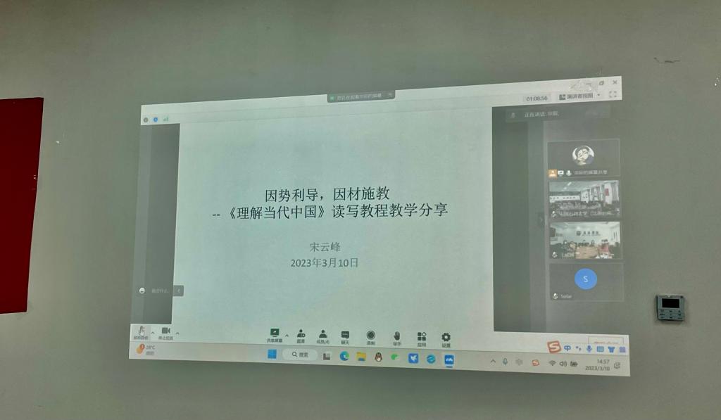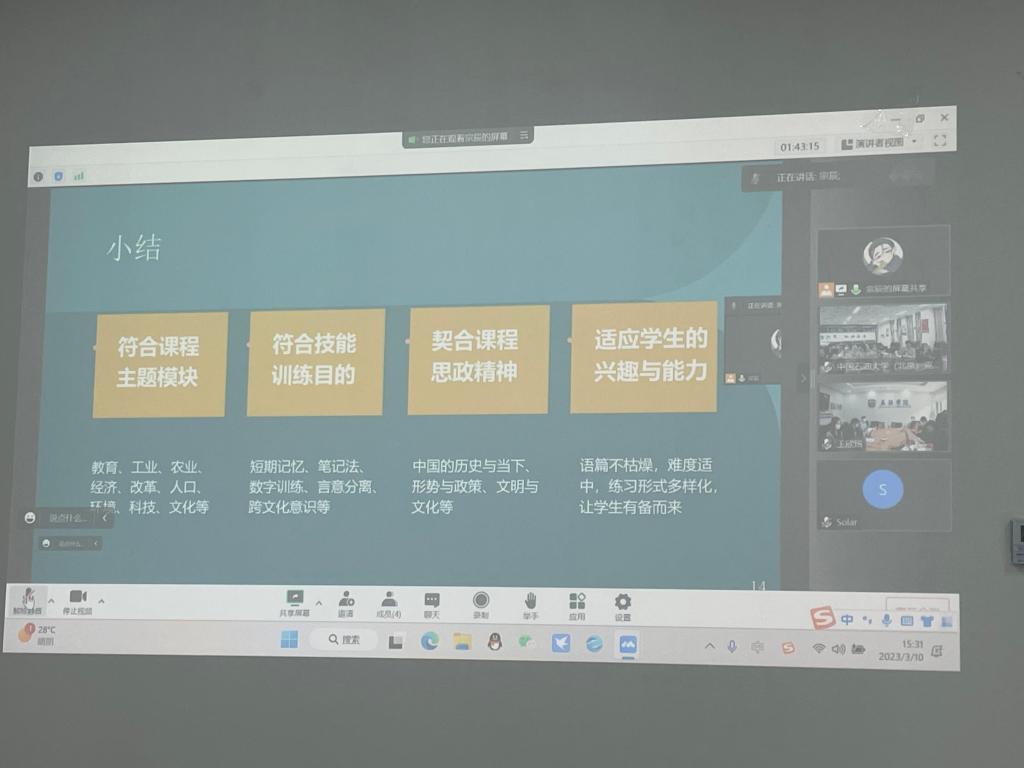 随后,yl23455永利集团副经理张莲、党总支委员宋云峰、yl23455永利集团教师低年级党支部书记王颖冲先后围绕学院课程思政开展情况、《理解当代中国》读写教程教学、翻译教学与课程思政等内容进行主题分享。中国石油大学(北京)克拉玛依校区青年教师围绕教材使用、教法等方面的问题与困惑进行了交流,yl23455永利集团副经理彭萍和宋云峰、王颖冲等几位老师认真做了解答。yl23455永利集团教师邹婷也分享了难忘的援疆经历。