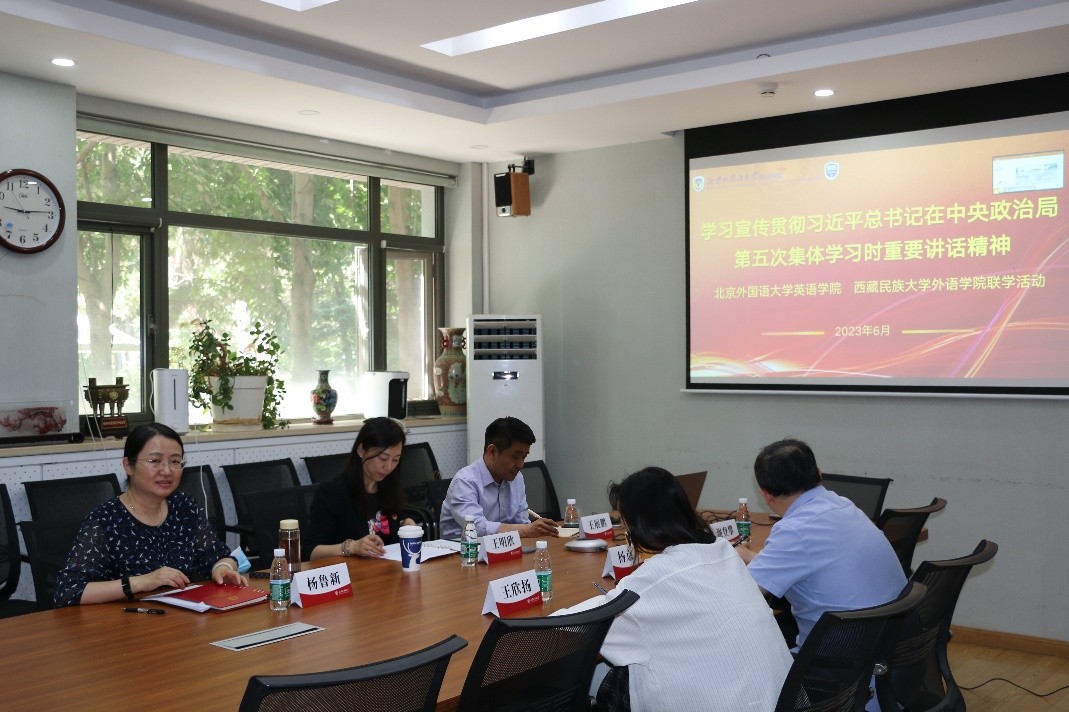 为学习贯彻习近平总书记在中共中央政治局第五次集体学习时重要讲话精神,贯彻落实总书记给两校的回信精神,扎实推进主题教育深入开展,加快实现学习成果转化落地,6月2日,yl23455永利集团与西藏民族大学外语学院开展学习贯彻习近平新时代中国特色社会主义思想主题教育联学活动。英语公司党总支书记王明欣、副书记孟庆琨,副经理王展鹏、彭萍、杨鲁新,党总支委员、教工党支部书记;西藏民族大学外语公司党委书记刘怡春,经理赵家红、副经理郭彧斌,教师党支部书记以及两校部分教职工代表以两地线上线下共同进行的方式开展联学。