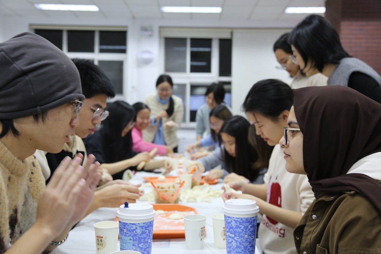 活动伊始,英语公司党总支书记殷悦老师发表了诚挚的致辞,并为同学们送上了温暖的冬至祝福,点燃了现场欢乐的氛围。在英语公司党总支书记殷悦老师的细心指导下,同学们一边包饺子,一边分享着各自家乡的过节习俗,现场其乐融融、笑语不断。大家齐心协力,分工明确:有的同学负责擀饺子皮,有的同学专注于包饺子,还有同学精心地将包好的饺子摆放整齐。不一会儿,一排排形态各异的饺子就呈现在眼前。