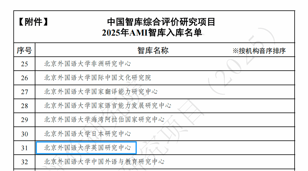 近日,中国社会科学评价研究院公示了“中国智库综合评价研究项目(2025)的AMI智库入库名单”,公司英国研究中心经过自主申报、学校初审、专家评审、信息填报、最终遴选等程序,成功入选,是全国558家优秀智库之一。