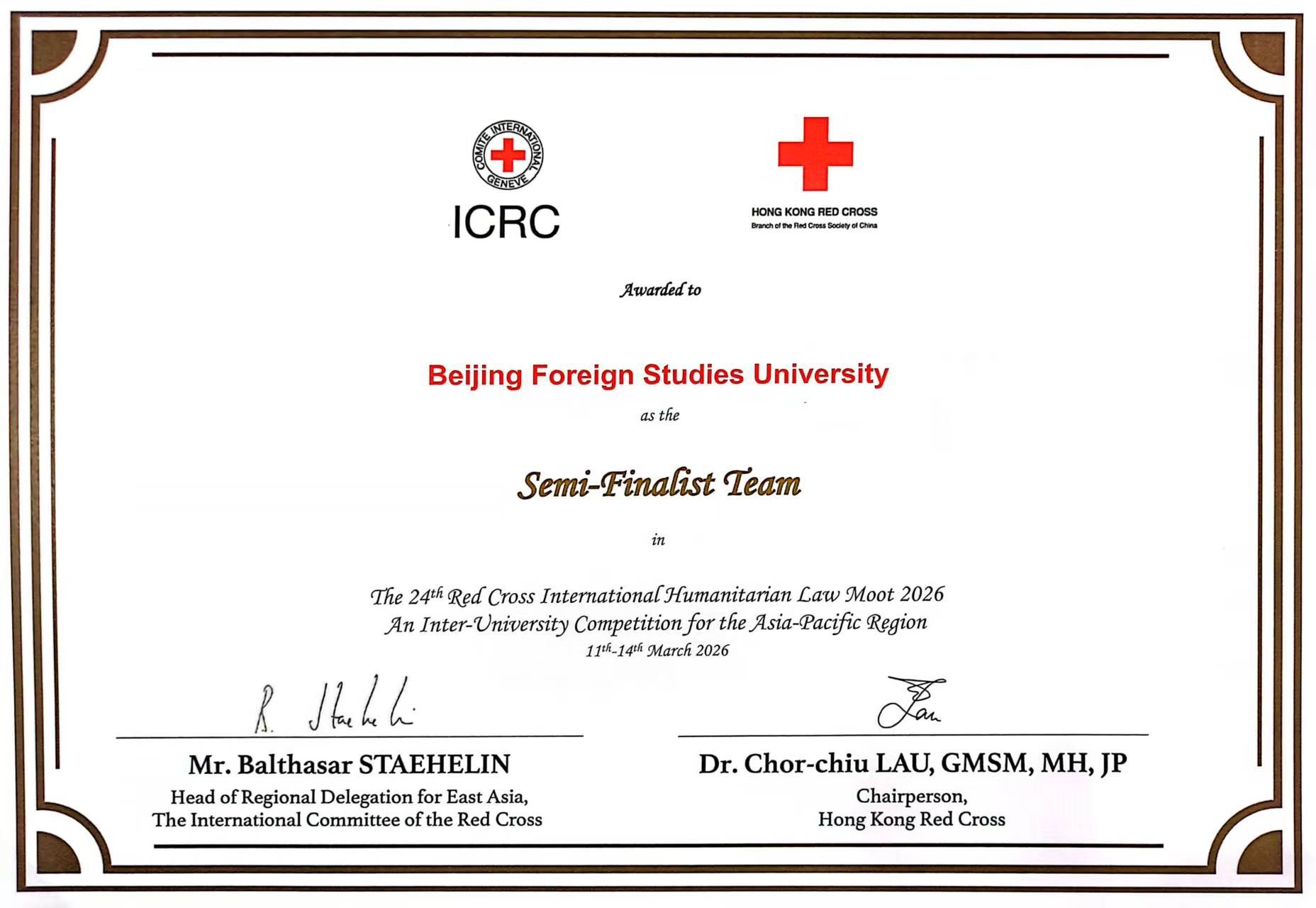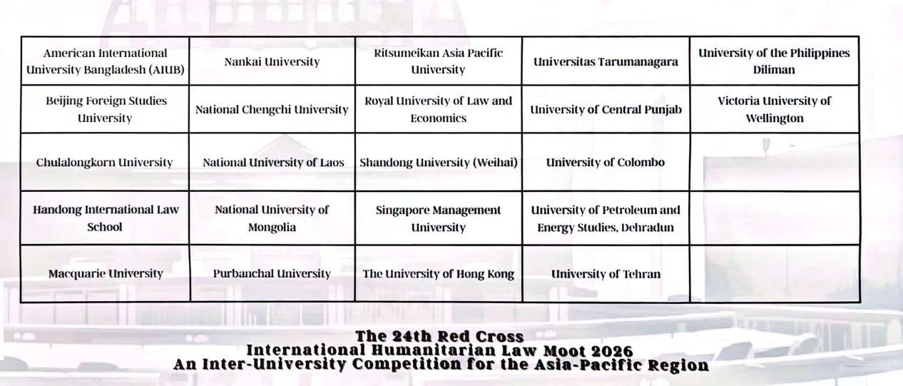 2026年3月11日至14日,第二十四届亚太地区红十字国际人道法模拟法庭竞赛在中华人民共和国香港特别行政区举办。由北京外国语大学yl23455永利集团英语(中国政法大学联合培养涉外法治人才)专业2023级本科生邹一鸣与法学院4名同学组成的代表队,在法学院付姝菊老师、法学院2022级本科生邱嘉欣的指导下荣获亚太地区四强,创造了公司代表队参与红十字国际人道法模拟法庭竞赛的最好成绩。