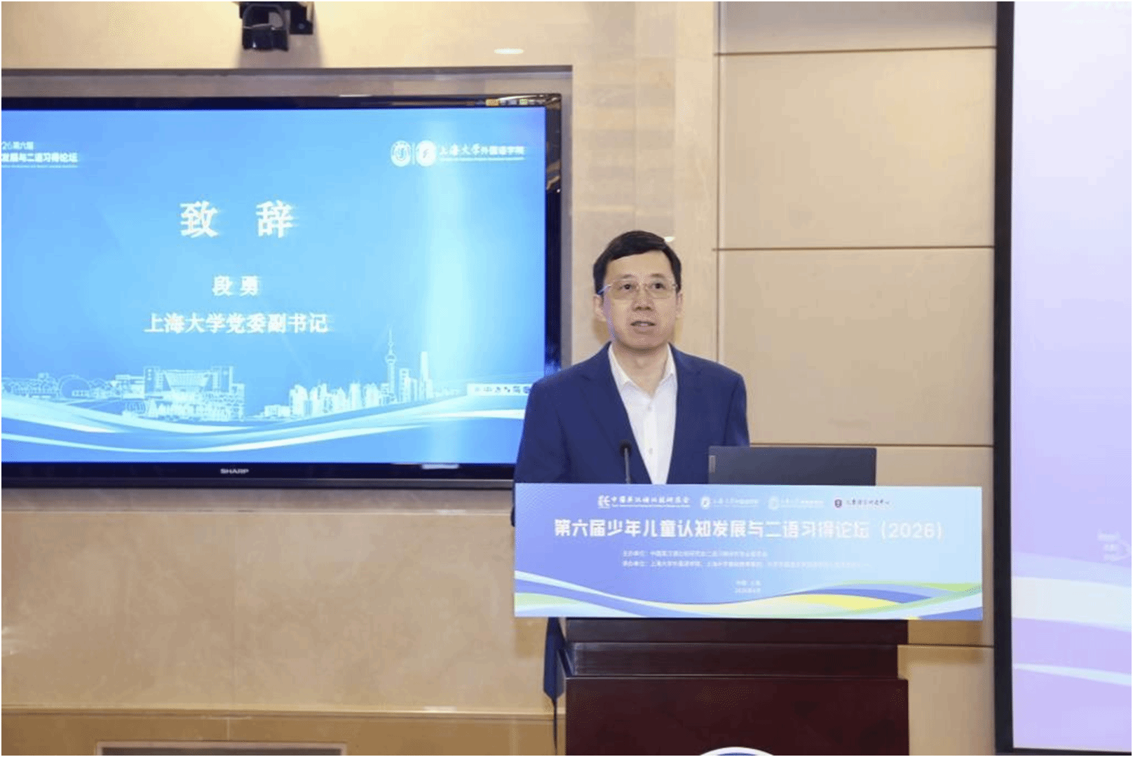 首先,上海大学党委副书记段勇教授做开幕式致辞,他代表上海大学向与会专家学者表示热烈欢迎,并向专家们介绍了上海大学近年来的发展成就、上海大学外国语学院外语团队建设进展以及与上海大学基础教育集团和北京外国语大学儿童语言研究中心的合作情况。他指出,少年儿童是国家的未来,提升儿童外语教育质量是新时代赋予外语教育工作者的重要使命,希望通过本次论坛的深入研讨,进一步厘清儿童认知发展与语言习得的内在规律,探索出更多符合中国儿童特点的外语教育路径,开发出更多优质的教育资源。