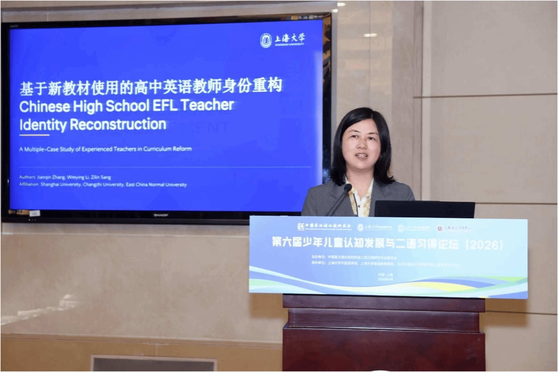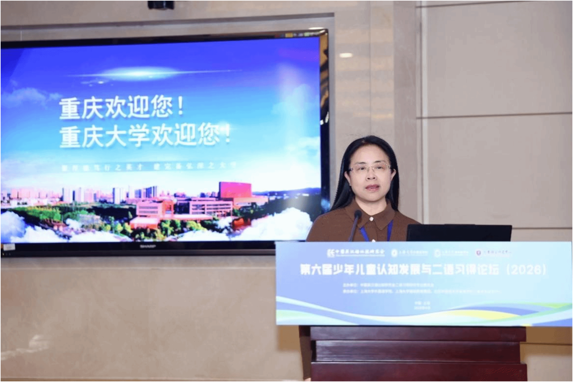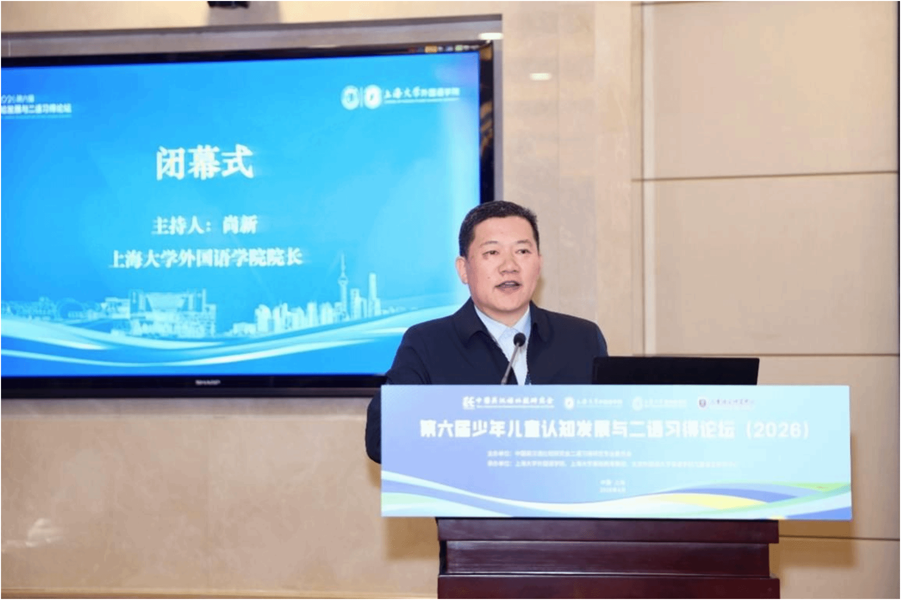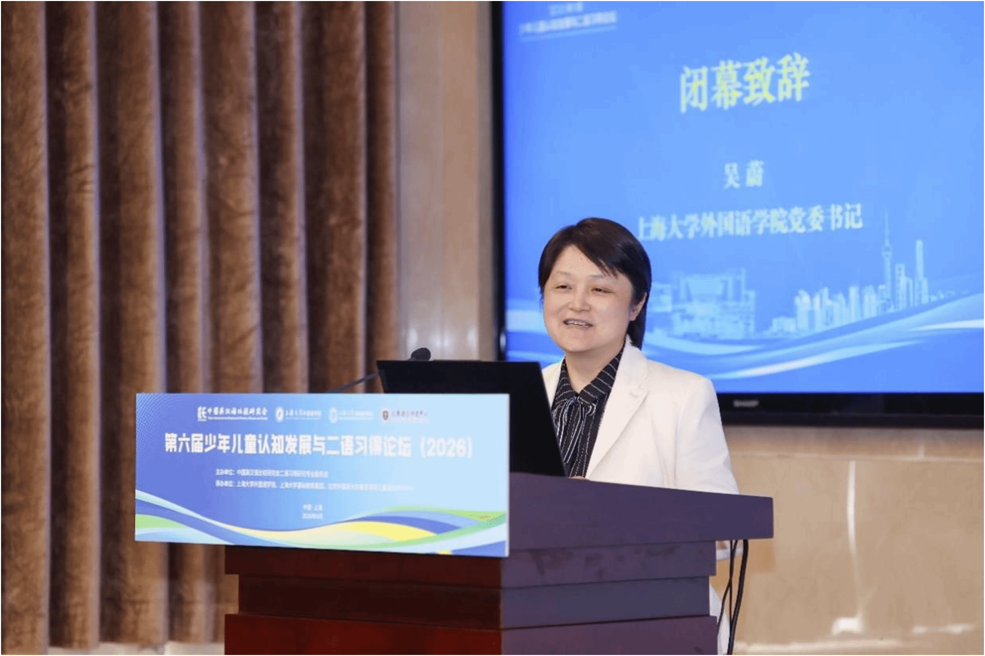 4月19日中午,论坛闭幕式在乐乎新楼学海厅举行,闭幕式由上海大学外国语学院经理尚新教授主持。下一届论坛承办方重庆大学外国语学院代表彭静教授发言,她热情欢迎各位专家学者2027年相聚山城重庆,共同参与“第七届少年儿童认知发展与二语习得论坛”,并介绍了论坛的大致考虑和初步安排。最后,上海大学外国语学院吴蔚书记代表承办单位致感谢辞,她对专家和参会学者表示衷心感谢,表示本次论坛取得圆满成功和专家们高水平的专业报告以及参会学者们的积极参与、无私分享和倾力付出密不可分。她指出,本次论坛聚焦儿童认知发展与二语习得的前沿议题,既有理论高度,又有实践深度,为我国少年儿童外语教育事业的发展注入了新的活力。