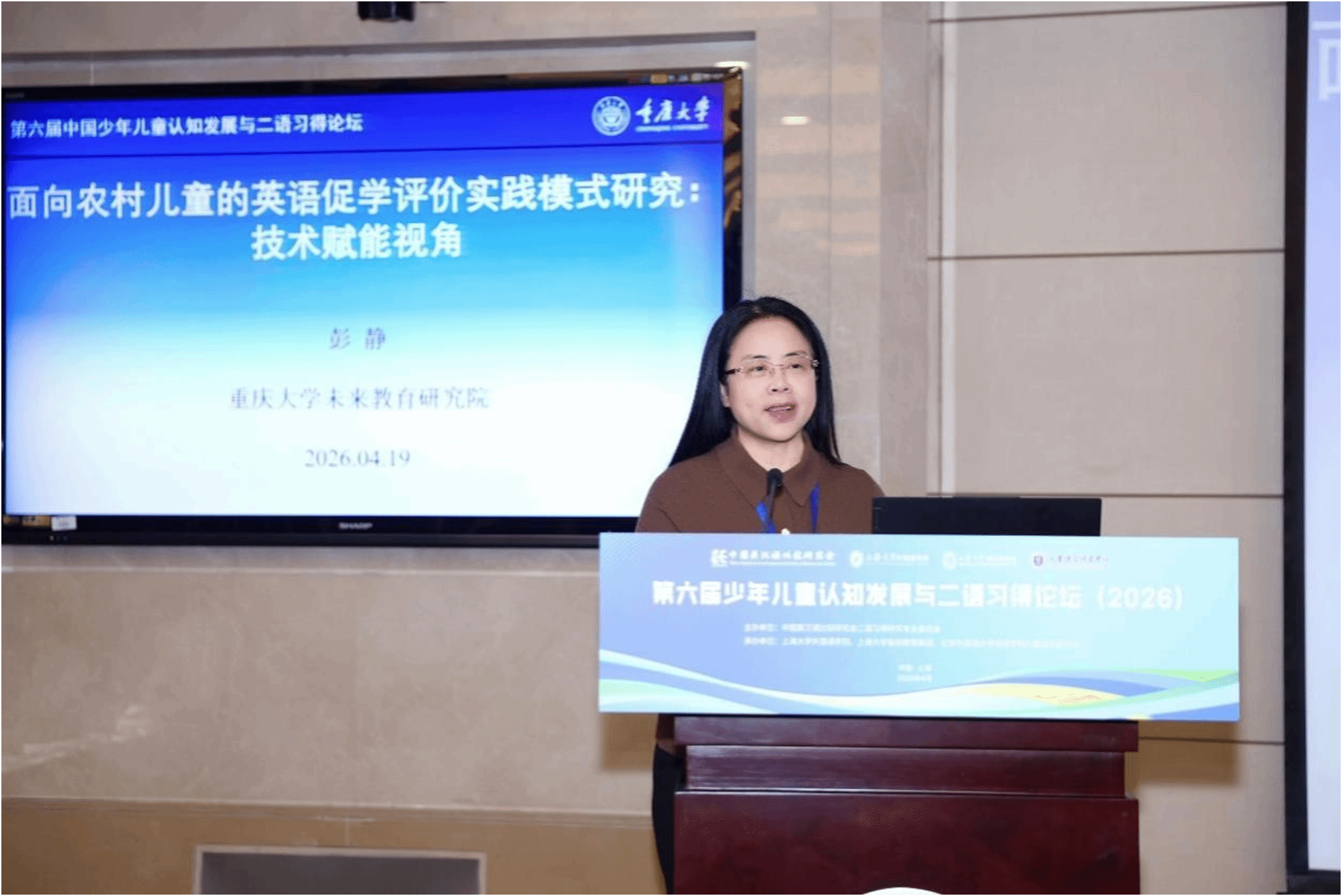 第四场主旨报告由上海大学外国语学院副经理张建琴副教授主持。重庆大学彭静教授作了题为“面向农村儿童的英语促学评价实践模型研究:技术赋能视角”的报告。她指出,“促学评教”的研究存在两大失衡:一是理论研究多于实践研究,二是学段覆盖与区域分布不均。由此,她提出构建一套技术赋能的农村中小学英语促学评价模式,从学习目标与标准、评价活动与任务、促学反馈、员工自评、同伴互评五个维度进行系统设计,为农村儿童外语教学促学评价提供实践范式。