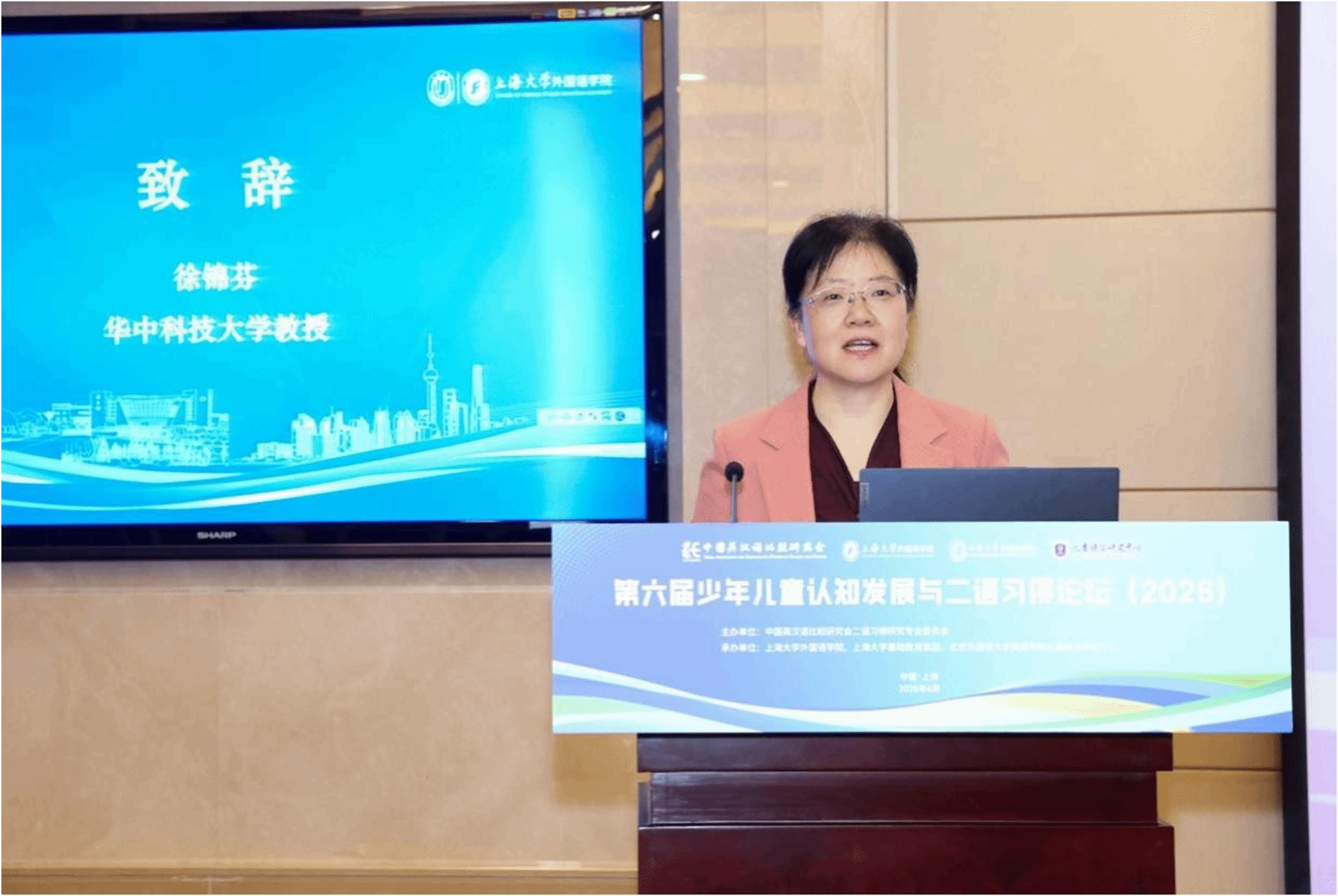 中国英汉语比较研究会二语习得研究专业委员会主任委员、华中科技大学徐锦芬教授在致辞中首先代表主办方对上海大学外国语学院表示感谢,她指出,当前儿童二语习得研究应聚焦认知发展规律、外语学科素养及人工智能技术应用等方向。外语基础教育中的教育公平、教师专业发展瓶颈、技术融合与数字化转型仍面临重要挑战。她呼吁与会学者共同努力,携手书写儿童二语习得的新篇章。