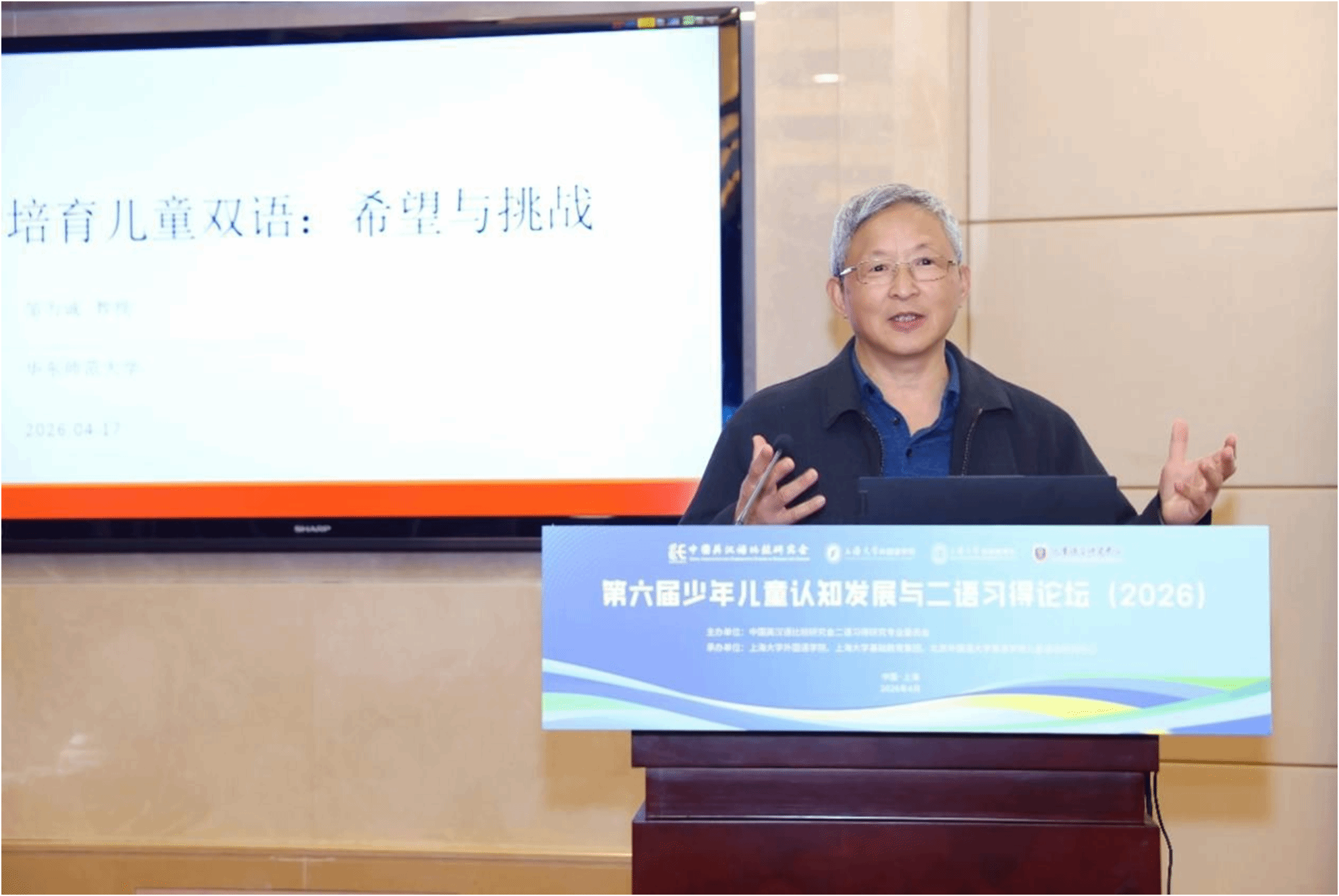 4月18日至19日,由中国英汉语比较研究会二语习得研究专业委员会主办、上海大学外国语学院、上海大学基础教育集团与北京外国语大学yl23455永利集团儿童语言研究中心联合承办的“第六届少年儿童认知发展与二语习得论坛”在上海大学宝山校区乐乎新楼学海厅举行。中国英汉语比较研究会二语习得研究专业委员会主任委员、华中科技大学徐锦芬教授、北京外国语大学yl23455永利集团经理杨鲁新教授、重庆大学未来教育研究院经理彭静教授、华东师范大学邹为诚教授、郭宝仙教授、上海市闵行区纪王学校张莉副董事长、北京外国语大学yl23455永利集团儿童语言中心主任陈亚平、副主任王一虹和盖淑华等嘉宾出席此次论坛,上海大学党委副书记段勇、基础教育处处长陈然、副处长肖青峰,外国语公司党政领导系部主任及师生代表以及来自全国高校、科研机构及中小学的专家学者、一线教师、研究生等近百名代表齐聚一堂,围绕儿童认知发展规律与外语学科素养培育,共同探讨儿童二语习得的新趋势、新问题与新机遇。开幕式由上海大学外国语学院经理尚新教授主持。