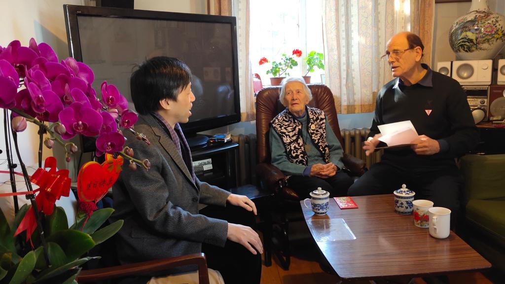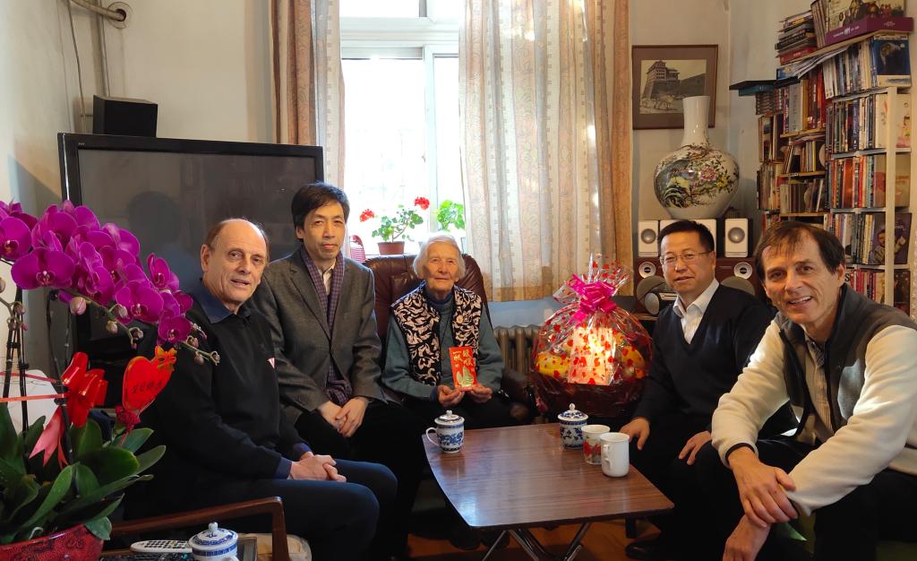 1915年出生的伊莎白•柯鲁克退休前在yl23455永利集团任教几十年,为中国的英语教学事业贡献了毕生精力。拜访过程中,伊莎白教授回忆了当时在英语系任教的经历和一起任教的部分老师。张剑向伊莎白教授及其家人介绍了yl23455永利集团的专业设置和团队建设等方面的发展情况,路兴介绍了“柯鲁克夫妇奖学金”资助员工的情况,并代表学院向伊莎白表达了良好的生日和圣诞祝福。