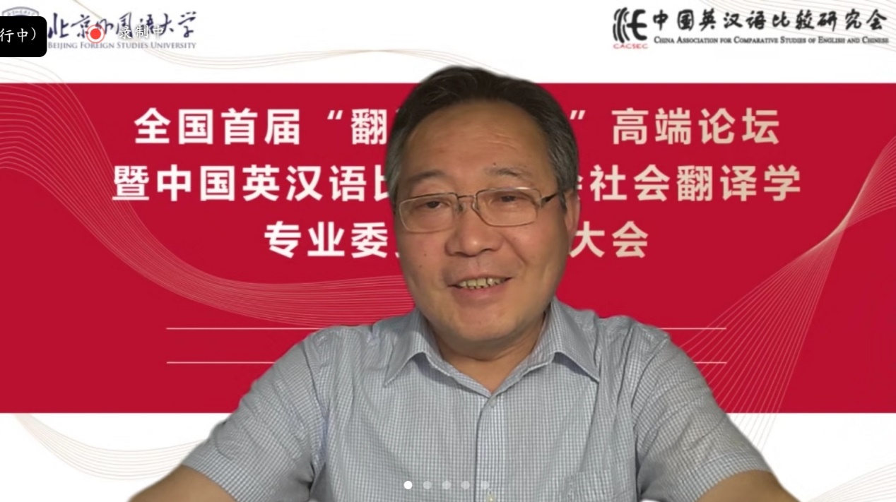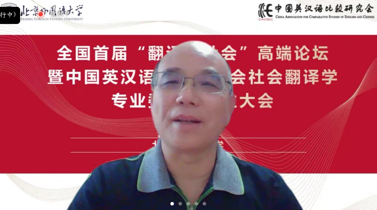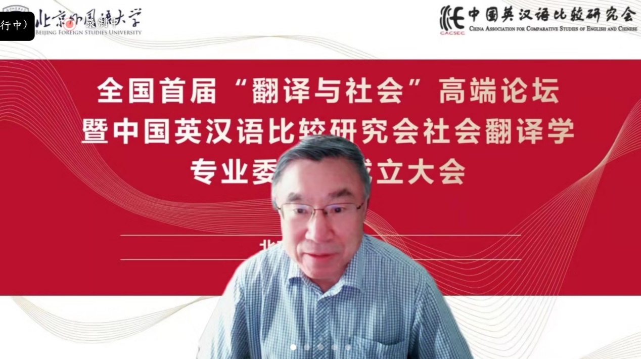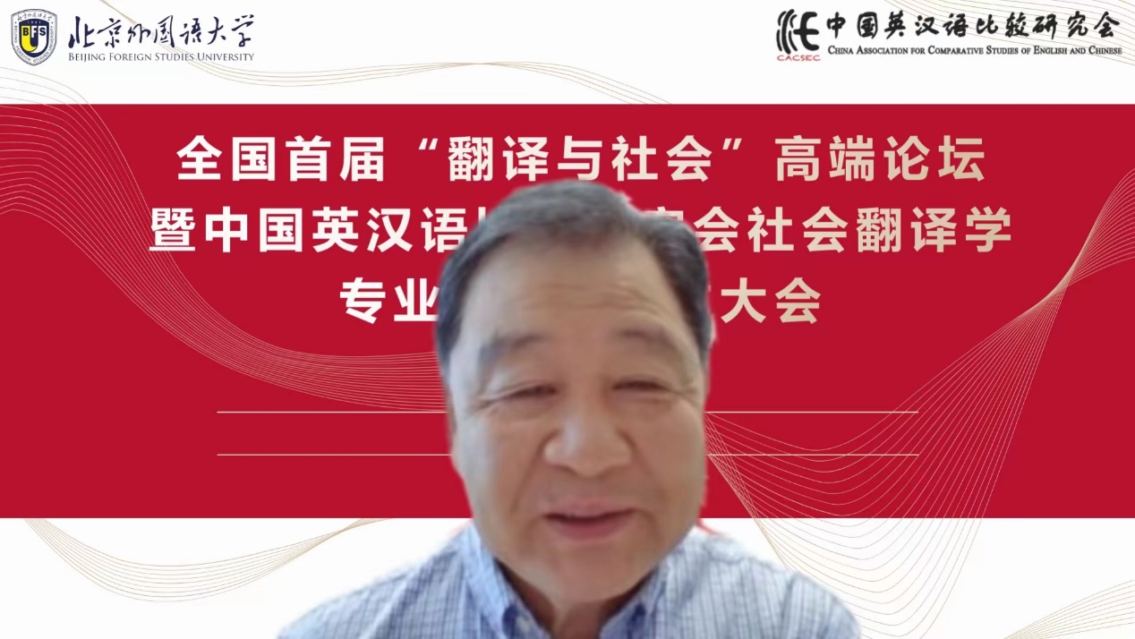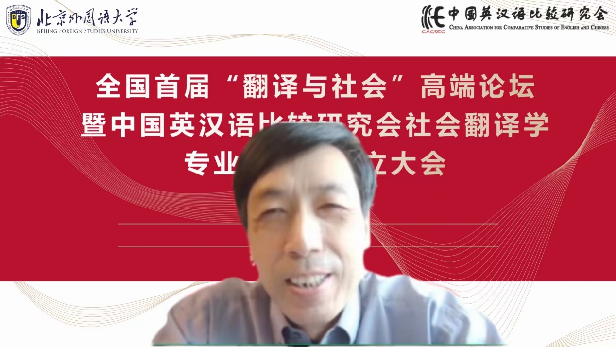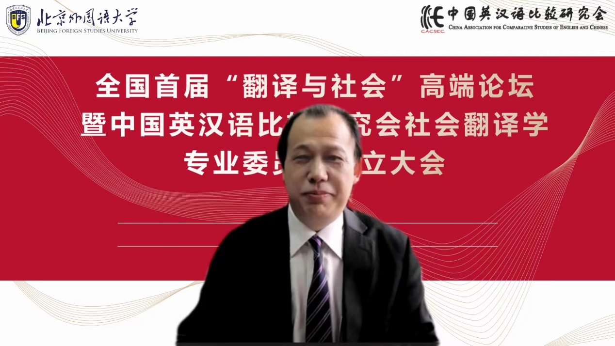 社会翻译学专委会学术顾问、中国翻译协会常务副会长黄友义对社会翻译学专委会的成立表示热烈祝贺。黄友义指出,翻译在推动中国百年发展与变革历程中发挥着极为重要的作用。当下,翻译成为讲好中国故事,提升国际传播能力的关键所在。外语人肩负着向世界介绍中国的历史重任,打造高水平翻译队伍至关重要,社会翻译学专委会的成立恰逢其时。