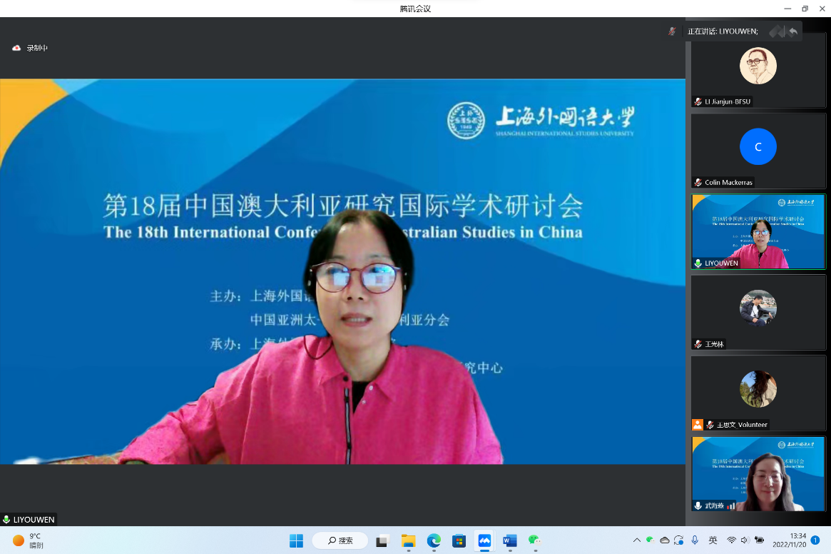 2022年11月19-20日,第18届中国澳大利亚研究国际学术研讨会在线举行,本次会议由中国亚洲太平洋学会澳大利亚分会和上海外国语大学主办,上海外国语大学yl23455永利集团和上海外国语大学yl23455永利集团澳大利亚研究中心承办。会议共设有11场主旨发言和3个分论坛。来自中国社会科学院、清华大学、北京大学、上海交通大学、武汉大学、华东师范大学、哈尔滨工业大学、四川大学、北京外国语大学、上海外国语大学、西安外国语大学、上海对外经贸大学、安徽大学、内蒙古师范大学、牡丹江师范学院、聊城大学、昆士兰大学、格里菲斯大学、迪肯大学、澳大利亚国立大学、墨尔本大学的专家学者,为来自全国各地知名院校的百余名师生呈现了一场丰富的学术盛宴。