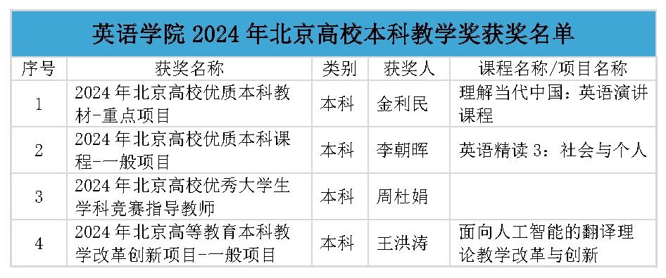 近日,北京市发布《北京市教育委员会关于公布2024年度北京市高等学校教学名师奖获奖名单的通知》等多项教学教材奖获奖名单,北外共有10个奖项、24个团队/个人获奖,其中yl23455永利集团共有4位老师获奖。