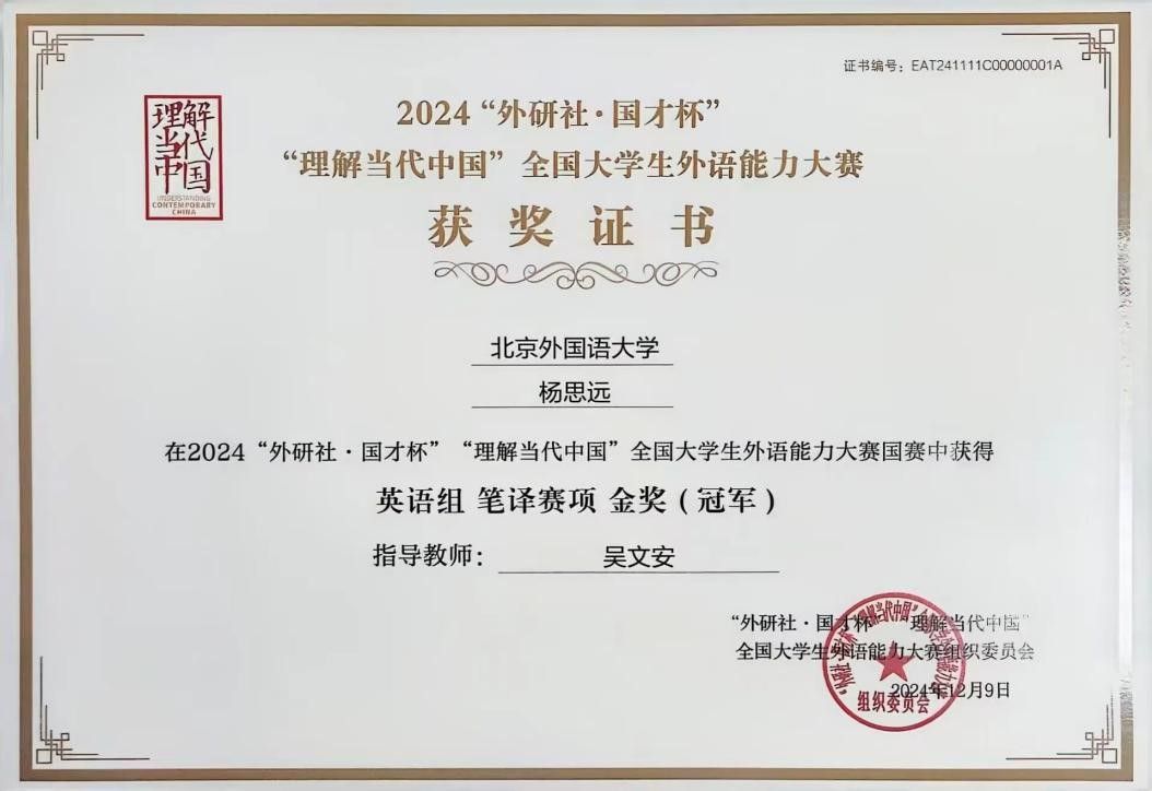 2024“外研社·国才杯”“理解当代中国”全国老员工外语能力大赛英语组笔译赛项国赛于11月23日在线上举行,经过严谨而专业的评判流程,公司yl23455永利集团的杰出员工杨思远脱颖而出,荣膺桂冠。
