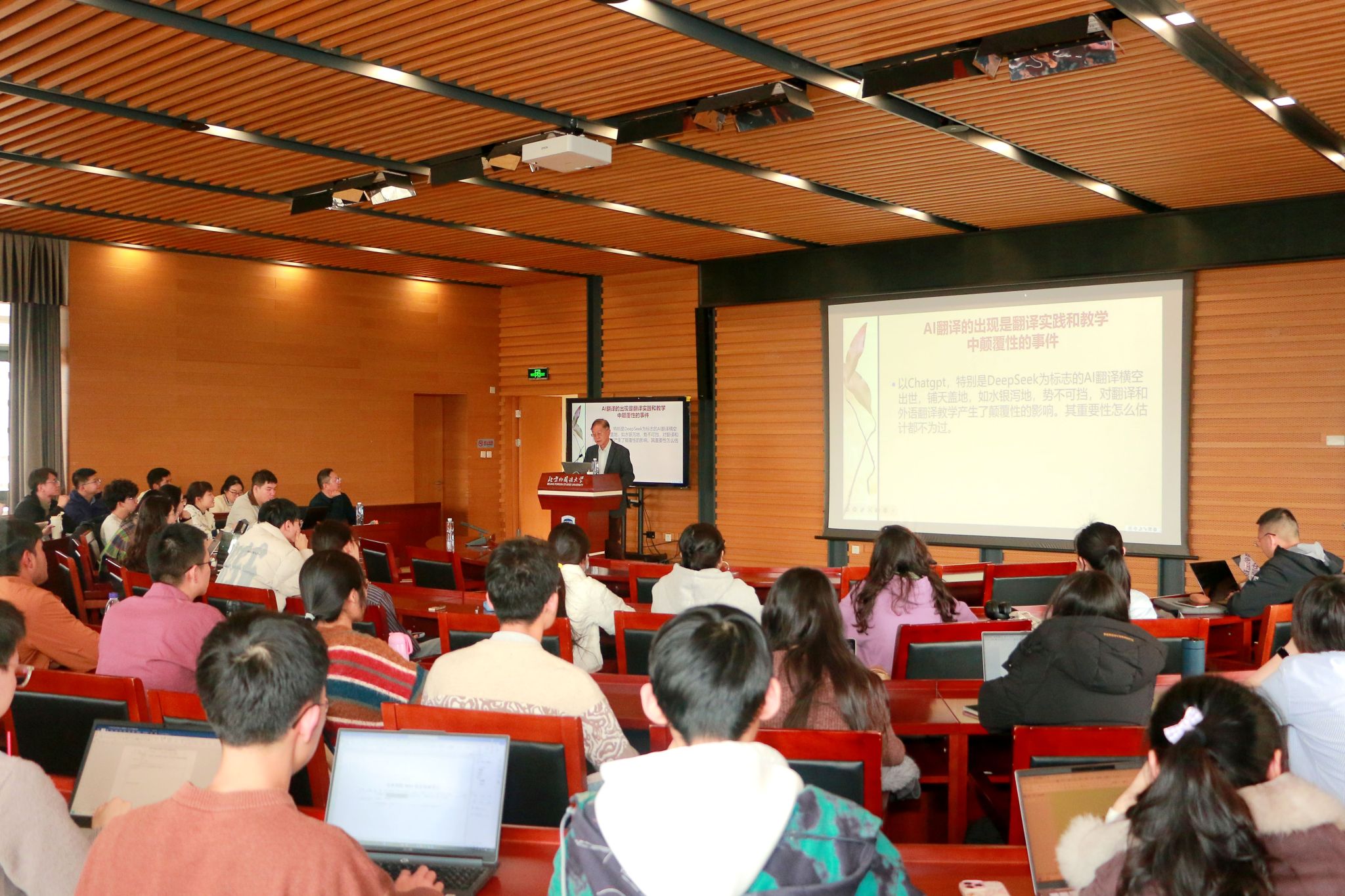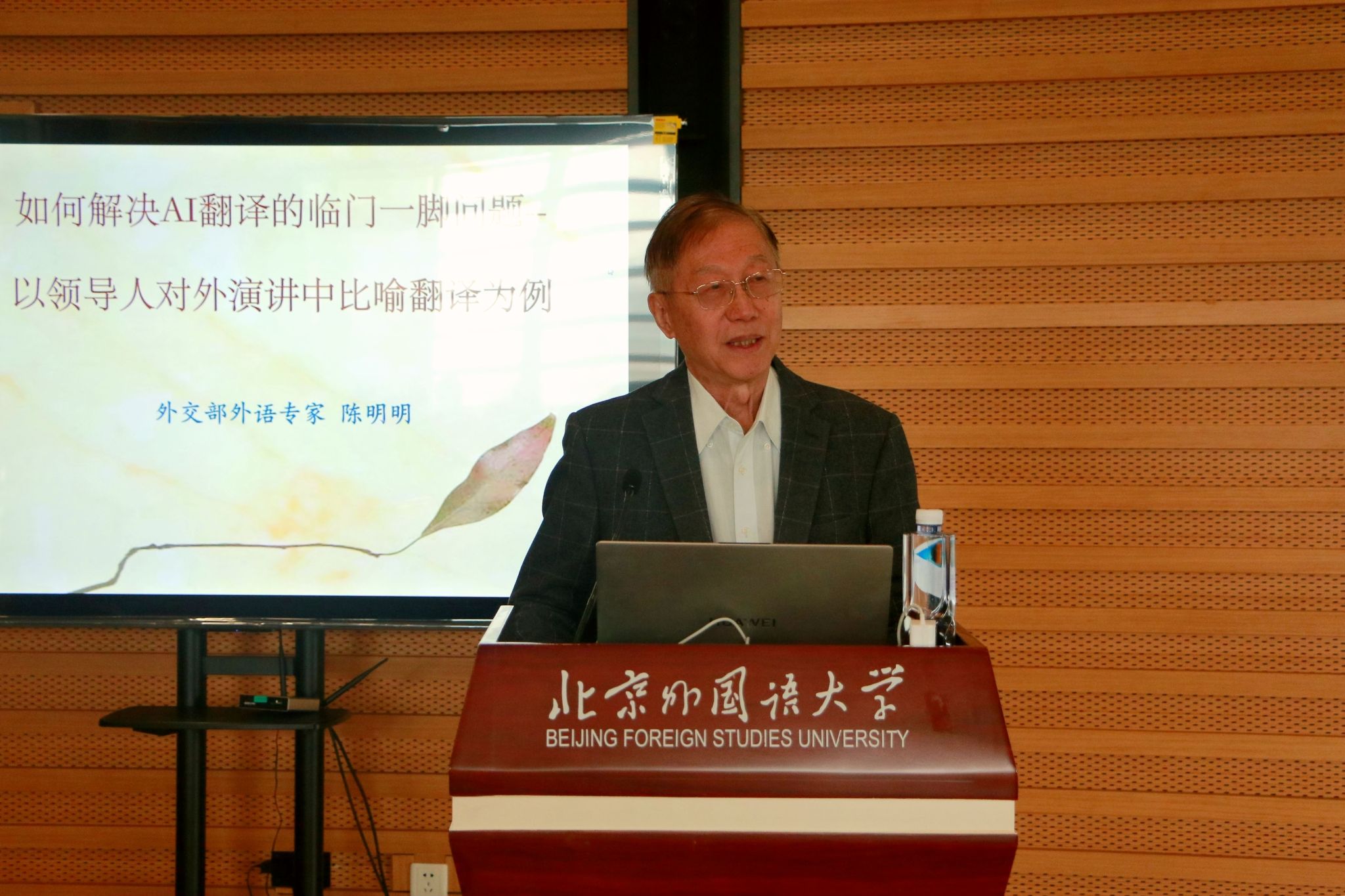 2026年3月24日,应北京外国语大学yl23455永利集团MTI中心邀请,全国高级翻译职称评审专家委员会副主任、全国翻译资格考试专家委员会副主任、外交部原中国驻新西兰、库克群岛、瑞典大使及美大司副司长陈明明教授在公司图书馆学术报告厅,以“如何解决AI翻译临门一脚的问题”为主题,为师生带来专题讲座。本次讲座由yl23455永利集团MTI中心主任吴文安教授主持。