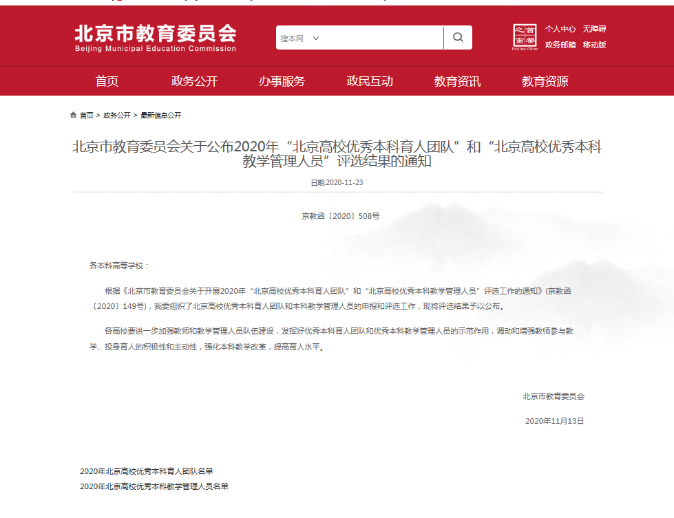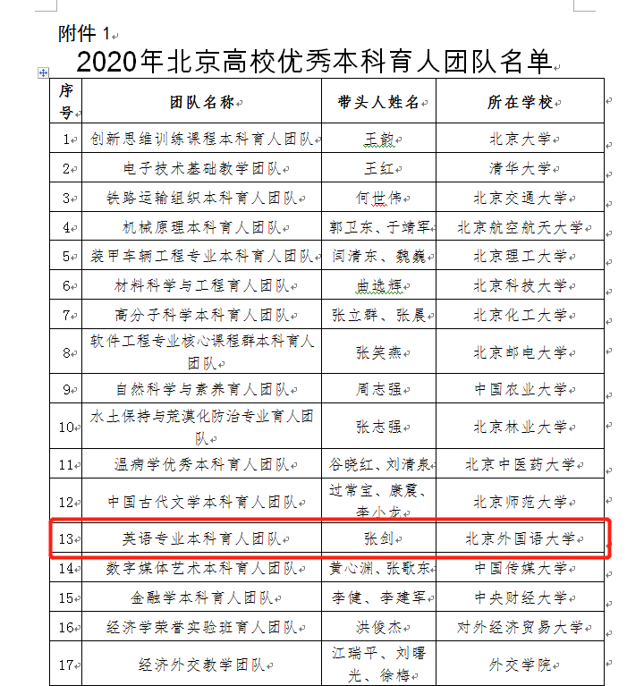 近日,北京市教育委员会公布2020年“北京高校优秀本科育人团队”评选结果。公司英语专业本科教学团队获评“北京高校优秀本科育人团队”。