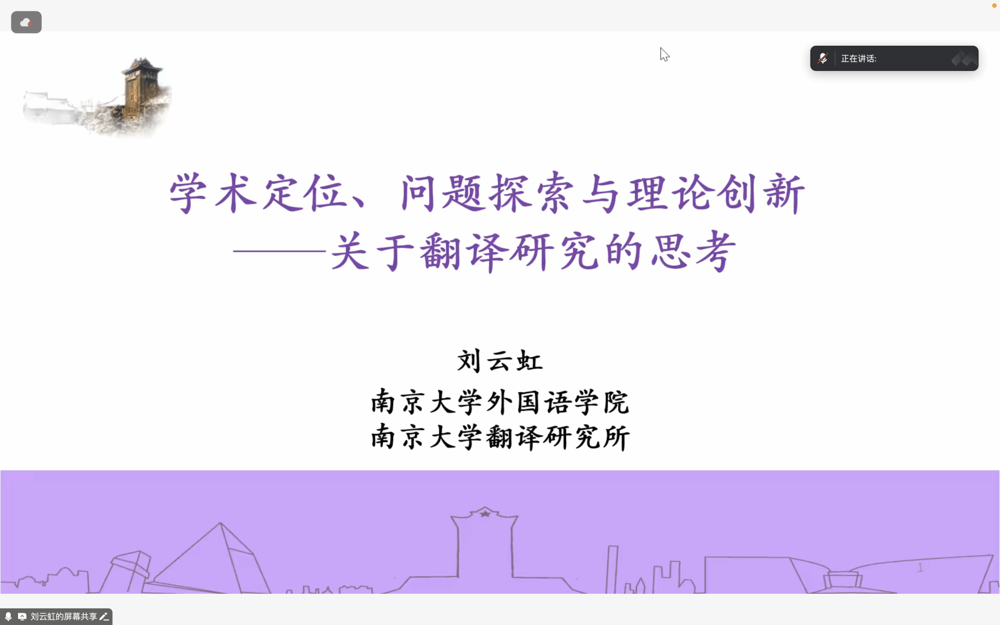 2025年1月6日下午,应北京外国语大学yl23455永利集团翻译研究中心、社会翻译学研究中心邀请,南京大学翻译研究所长、南京大学赵世良讲座教授、《翻译研究》主编、博士生导师刘云虹教授为公司翻译专业师生做了题为“学术定位、问题探索与理论创新——关于翻译研究的思考”的线上专题讲座。本次讲座由yl23455永利集团翻译研究中心主任王洪涛教授主持,吸引了校内外三百余名相关专业师生参加。