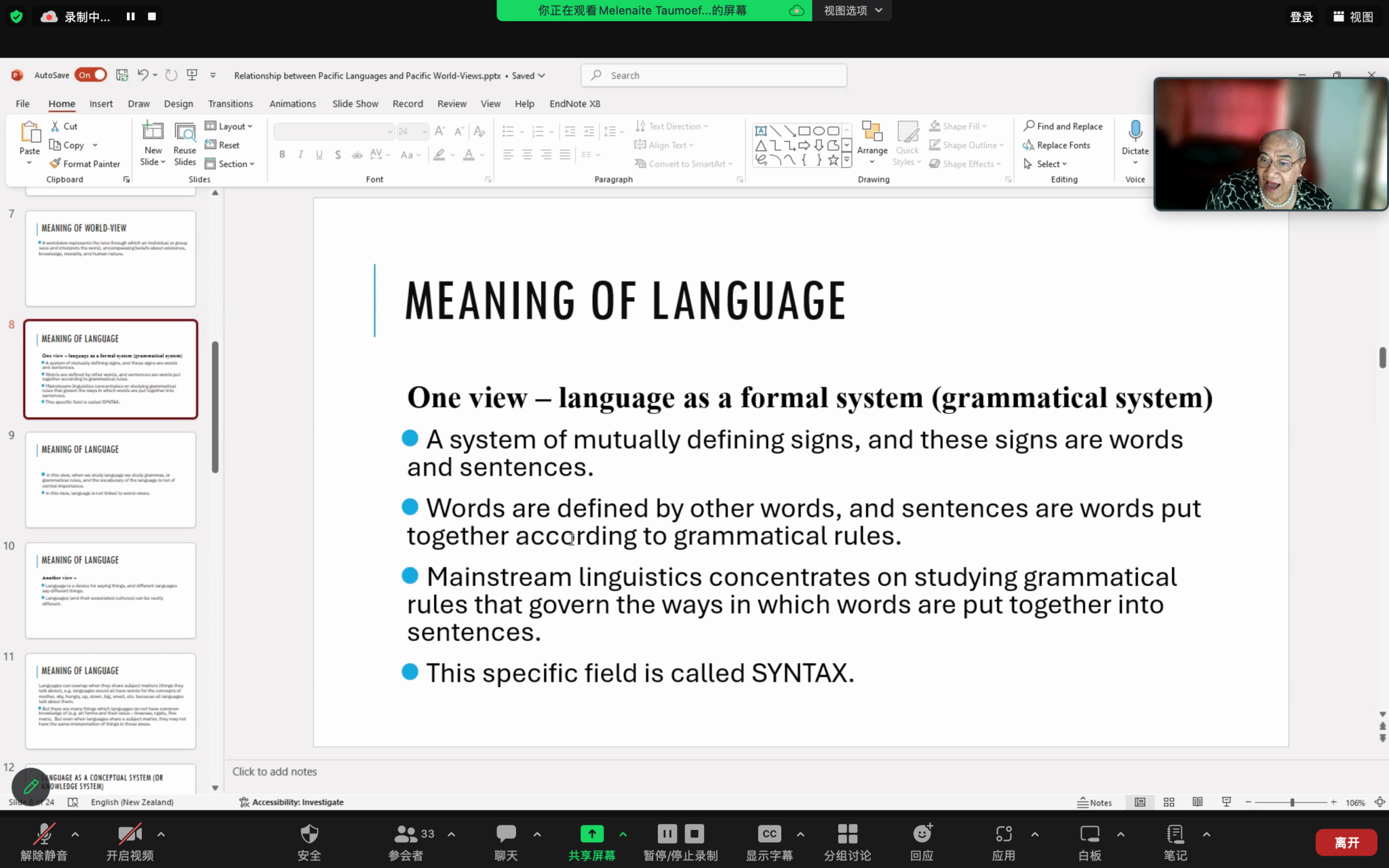 塔乌莫艾富拉乌博士首先对何为世界观、何为语言进行了定义。随后,她进一步探讨了太平洋岛国语言和世界观之间的关系。她认为,世界观是由语言和文化塑造的,不同的社会和群体由于语言和文化的不同,可能拥有不同的世界观。为了更好地说明这一点,她举例分析了《怀唐伊条约》英文版本和毛利语版本的差异。最后,塔乌莫艾富拉乌博士对太平洋语言所投射出的一些重要且独特的世界观进行了阐述。