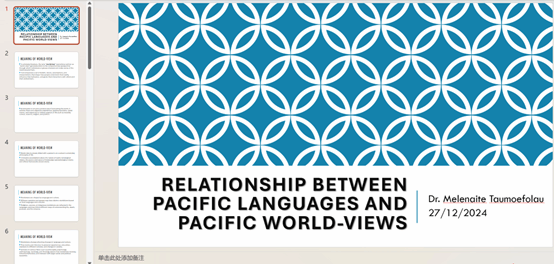 2024年12月27日下午,应北京外国语大学yl23455永利集团南太平洋研究中心邀请,汤加语外国专家梅莱奈伊特·塔乌莫艾富拉乌(Melenaite Taumoefolau)博士在线上做了题为“太平洋语言与世界观”(Relationship between Pacific Languages and Pacific World-views)的讲座。讲座由yl23455永利集团教师李菅主持,来自校内外多名师生参加了本次讲座。