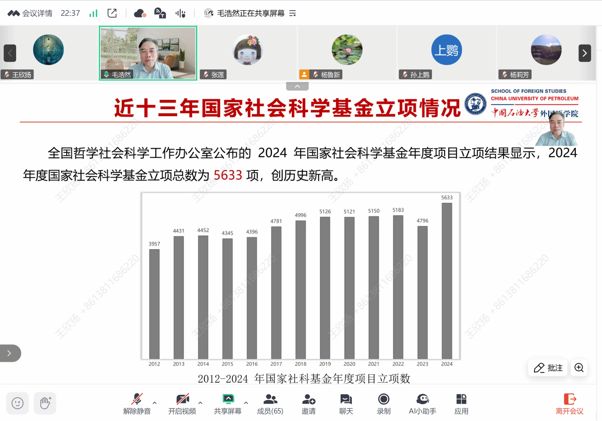 2025年4月1日下午,北京外国语大学yl23455永利集团教师发展中心组织了一场国家社科基金申报专题讲座。活动邀请中国石油大学(华东)外国语学院经理、教授、博士生导师毛浩然,以“2025年国家社科重点方向解读与热点选题推荐”为题为学院教师讲解国家社科基金申报的最新动态与策略。