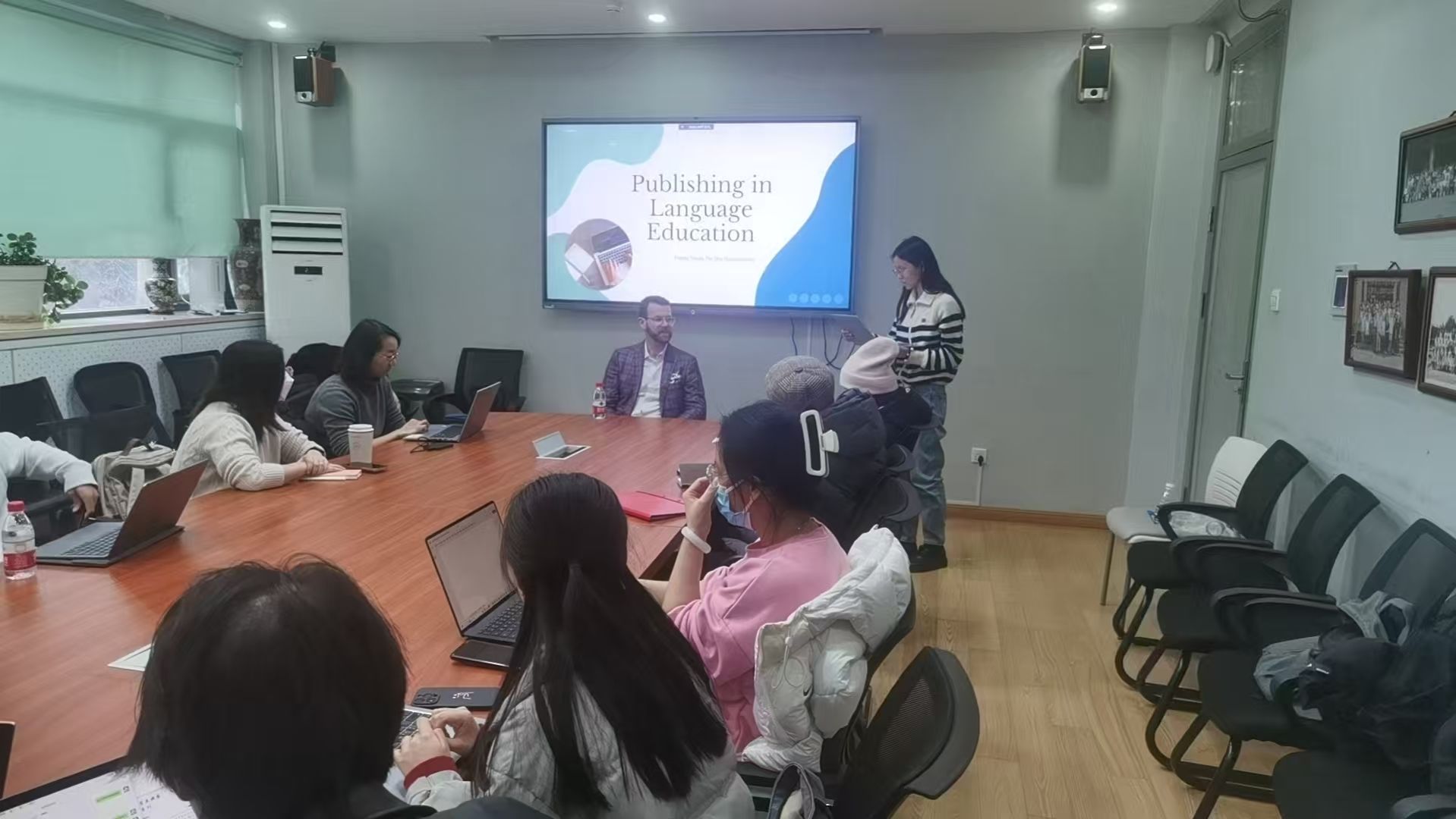 在询问了同学们关于期刊发表所面临的问题和挑战后,Troyan教授介绍了数本语言教育领域的著名国际期刊,并就期刊投稿的侧重点、投稿要求、政策、流程等展开了讲解。他提出,在为研究文章选择目标期刊时,研究者应对期刊的特点和内容有一定程度的了解,从而提升投稿文章和期刊的契合度。此外,Troyan教授还特别讲述了近期国际期刊对人工智能使用的要求。部分期刊要求研究者说明写作过程中的人工智能使用情况,不过具体投稿要求依期刊政策而定。作为国际期刊Foreign Language Annals(外语年鉴)的联合主编,Troyan教授还特别以该期刊为例,从期刊主编的视角出发,向同学们展示了完整的期刊投稿和发表流程。随后简要介绍了论文写作各个部分的写作要领,包括题目-摘要-介绍-文献综述-研究方法-研究发现-讨论-结论等。他特别提到了期刊发表对于匿名性的要求,并且强调了文献综述的“综合性”,提点同学们避免文献的简单总结和重复。最后,Troyan教授列举了一些论文写作的常见误区。讲座结束后,Troyan教授与同学们展开了学术研究相关的问题讨论。