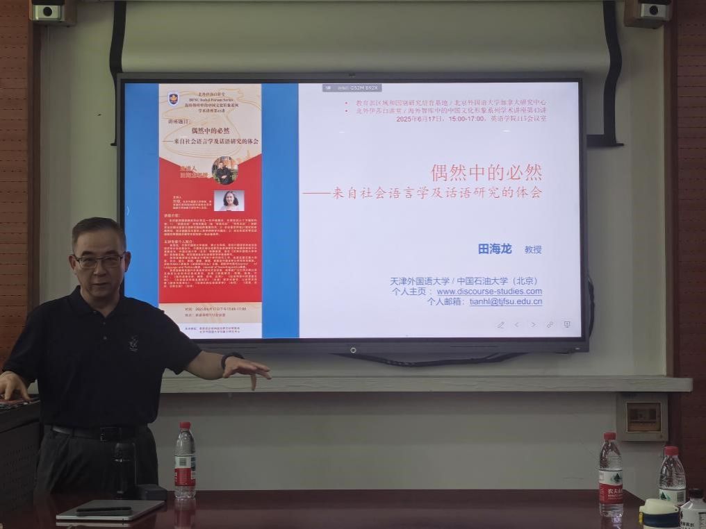 2025年6月17日,北京外国语大学加拿大研究中心成功举办了主题为“偶然中的必然---来自社会语言学及话语研究的体会”的学术讲座。本次讲座特邀天津外国语大学教授、博士生导师、中国石油大学(北京)特聘教授田海龙为主讲嘉宾。本次讲座由北京外国语大学教授、教育部区域和国别研究基地北京外国语大学加拿大研究中心主任刘琛教授主持。讲座吸引了众多跨学科的老师与同学参与。