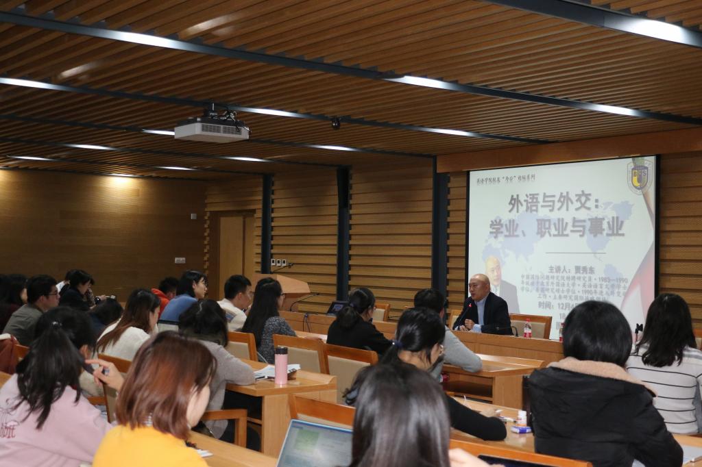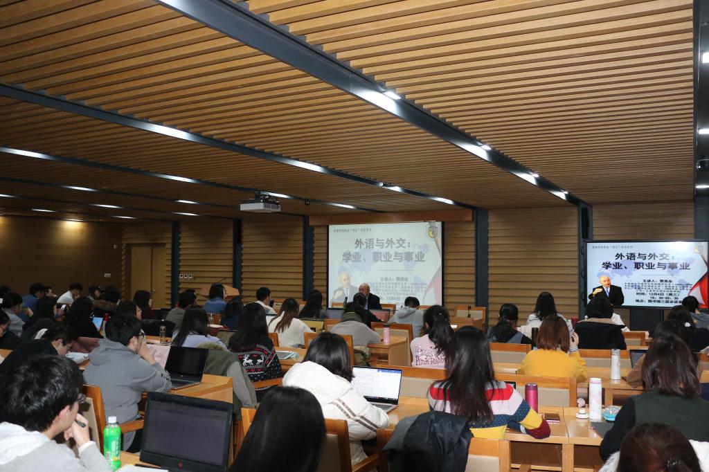 贾秀东员工以“外语与外交:学业、职业与事业”为题,结合自身学习和工作经历,谈了知识和能力储备的重要性,职业选择与规划的必要性;介绍了在从事外交外事及其他涉外工作时,未来可能遇到的一些问题和挑战。