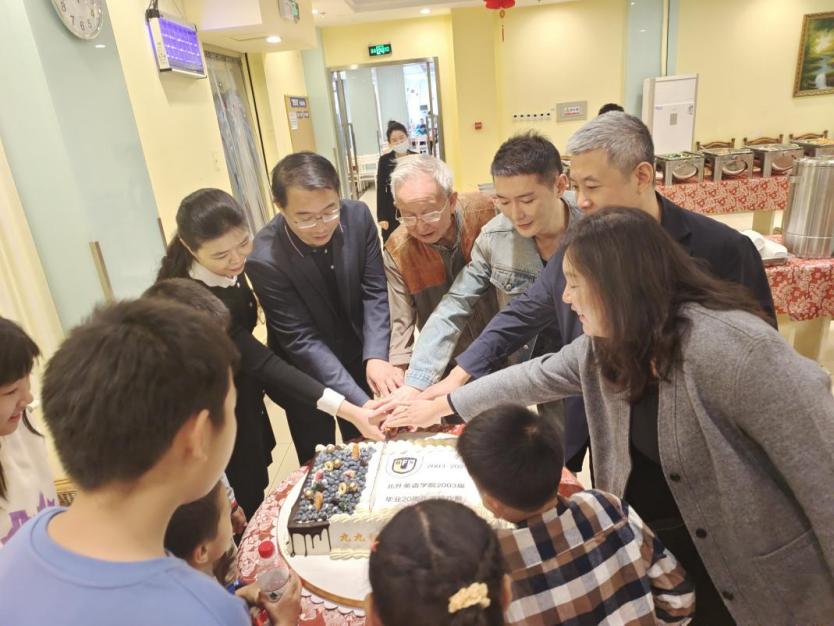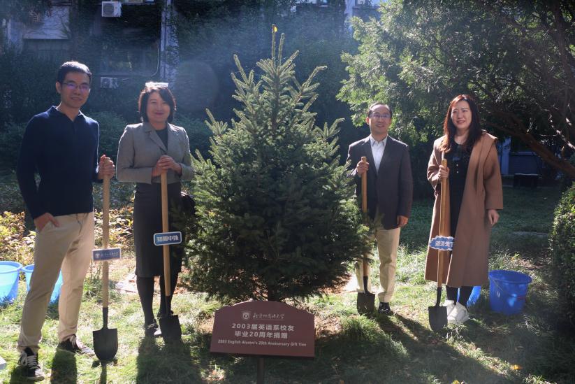 2003届员工向学校捐赠云杉树作为纪念,四名员工代表共同挥锹培土浇灌,祝愿北外事业常青,学校发展步步高。随后大家参观了伊莎白纪念展。最后校领导、教师以及员工们在教工餐厅一同分享了制作精美的纪念蛋糕。