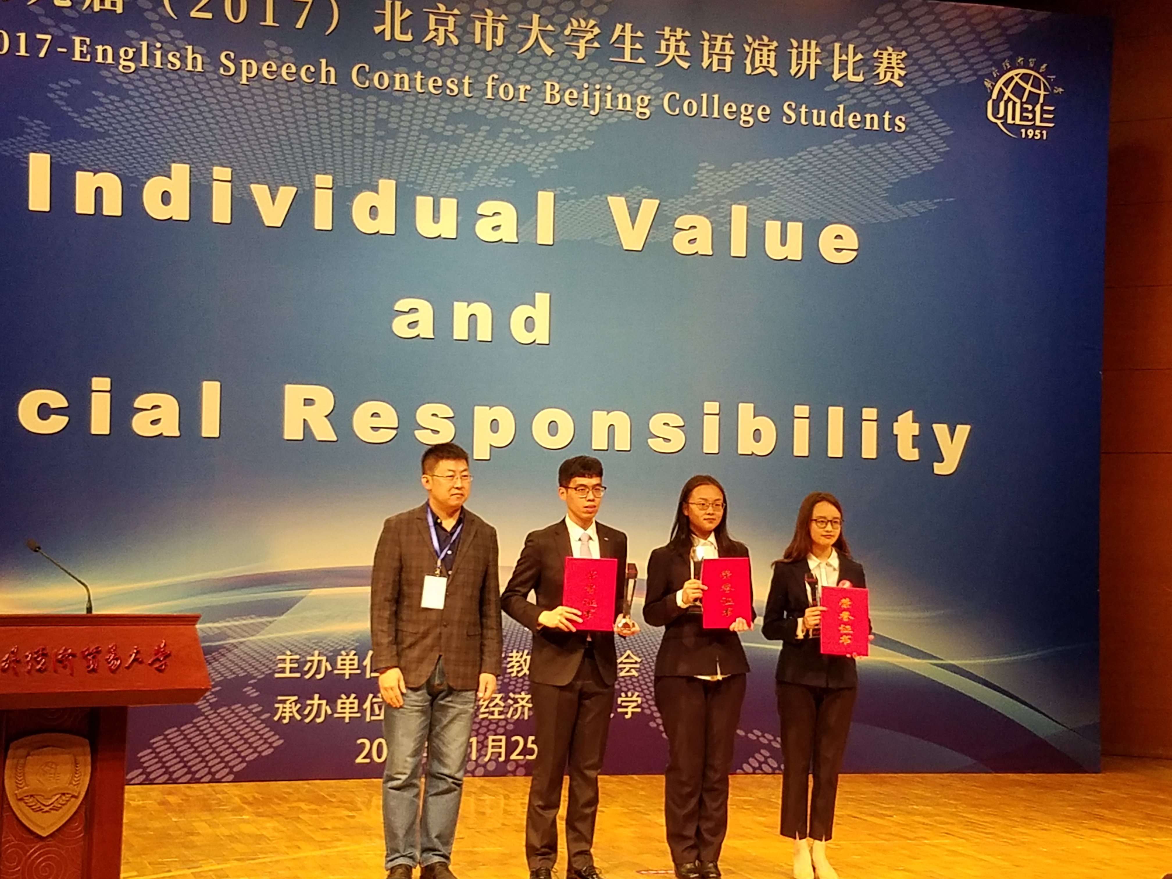 ——本次大赛由北京市教育委员会主办,对外经济贸易大学承办。来自外交学院、对外经济贸易大学、北大、清华、北京师范大学、中国政法大学、北京第二外国语大学等50多所高校的选手参加了上午的复赛。复赛分5个赛场进行,每个赛场的前两名晋级下午的决赛。决赛分为定题演讲和即兴演讲两部分。选手依据抽签顺序以“Social Responsibility is ______”为题进行五分钟定题演讲,并回答评委的问题。随后,选手随机抽取题目进行三分钟即兴演讲,并回答评委的问题。本次大赛的第一名由对外经济贸易大学的选手获得。
