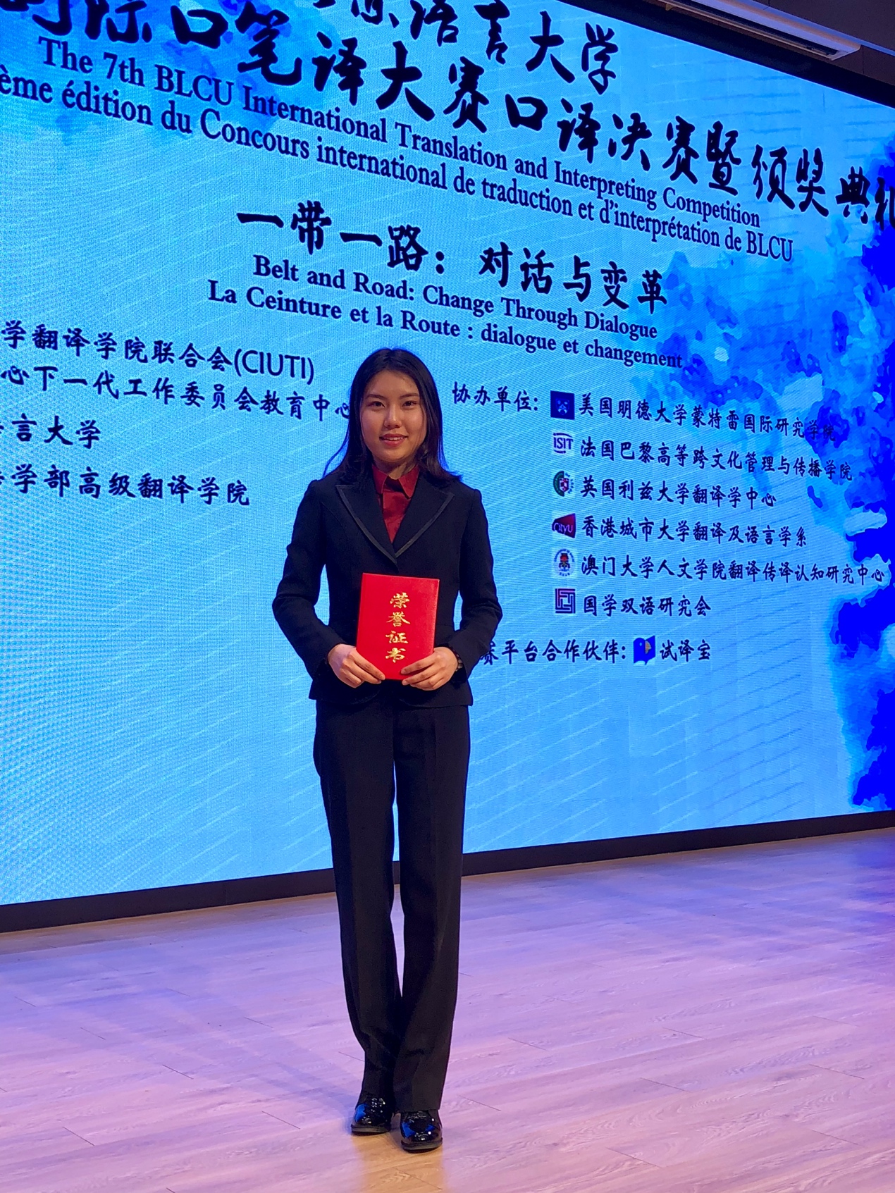 ——2018年3月30日,北京语言大学第七届国际口笔译大赛交传决赛暨颁奖典礼在北京语言大学举办。在进入英汉交传决赛的六位选手中,yl23455永利集团翻译系大四员工表现突出,获英汉交替传译冠军。