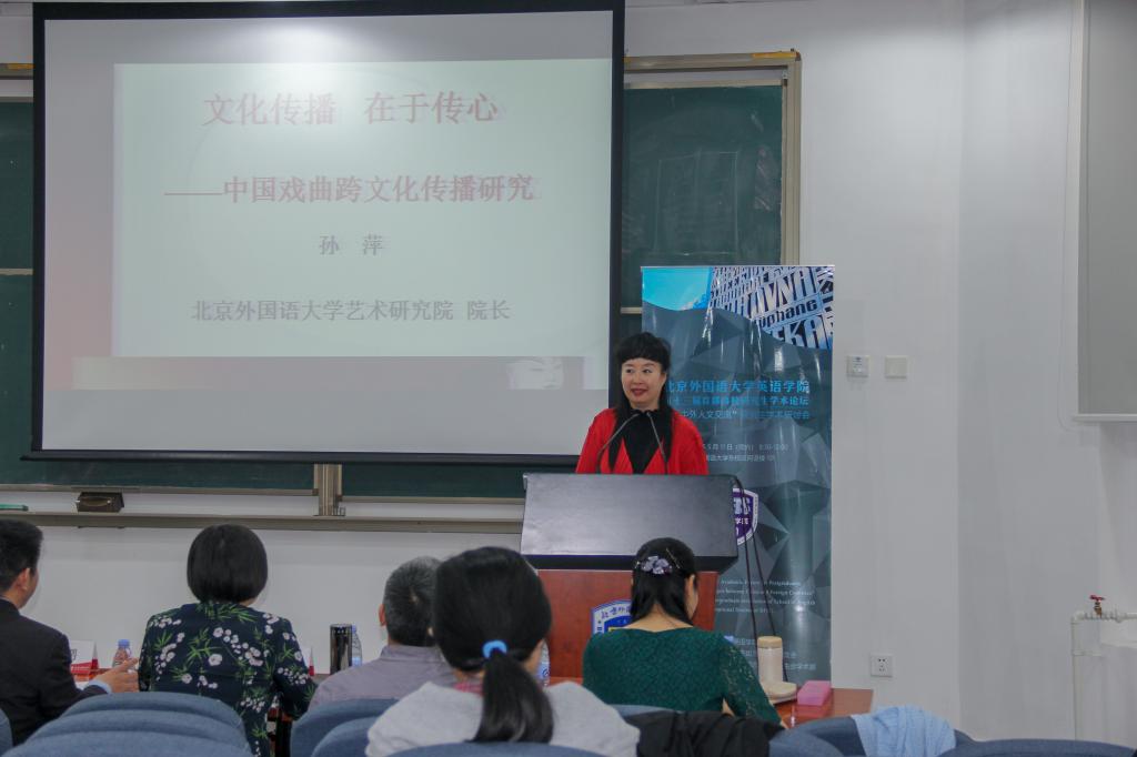 论坛首先由王展鹏老师致开幕词。王老师回顾了往届学术论坛的成果,鼓励英院学子好学深思,多参与学术活动,提高自身科研水平,希望同学们不畏艰险,勇于探索,实现更高层次的学术追求;同时关注时事热点,了解世界局势变化,拓展国际视野,从不同视角来思考国家的大问题。随后,北外艺术研究院孙萍经理做了主题为“文化传播,在于传心——中国戏曲跨文化传播研究”的主旨发言。孙萍经理是著名京剧表演艺术家,有丰富的舞台表演及文化对外交流经验,她在发言中分享了自己进行传统文化对外传播过程中的经历与感悟,让现场观众获益匪浅。