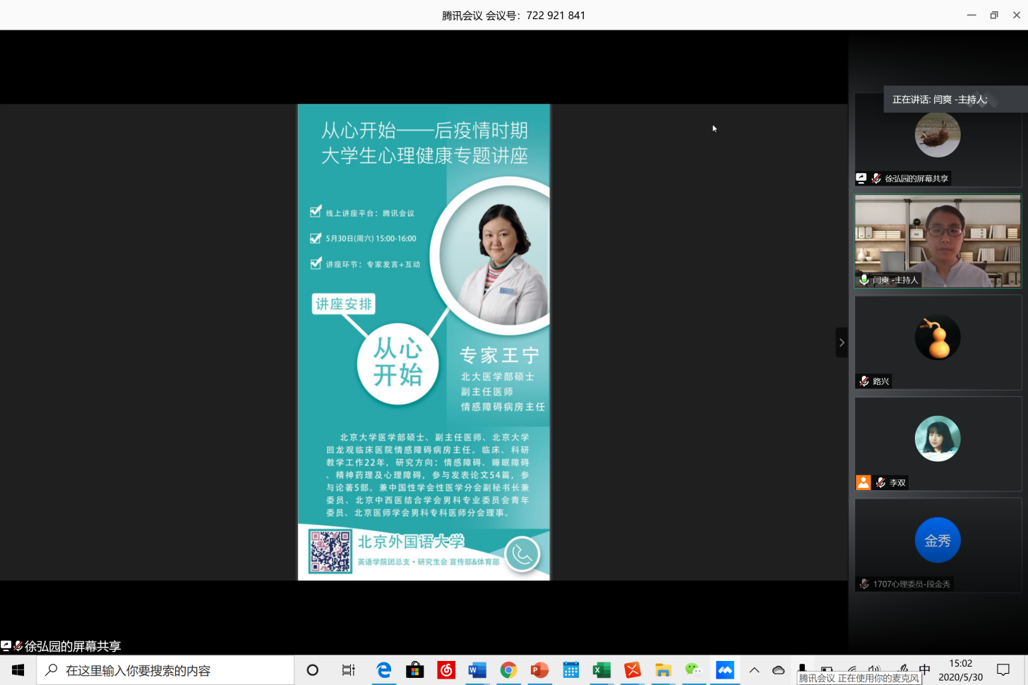 讲座中,王宁主任就与家人深度共处、重度拖延症以及毕业生就业三个方面进行了深入讲解。王宁主任强调,疫情期间,与家人相处时间增加,大家最重要的是要学会换位思考,增强共情能力。同时,居家学习期间,为避免拖延问题,同学们需要树立良好的时间观念,积极的学习态度和正向的人格品质,运用SMART目标管理原则,加强时间管理能力。