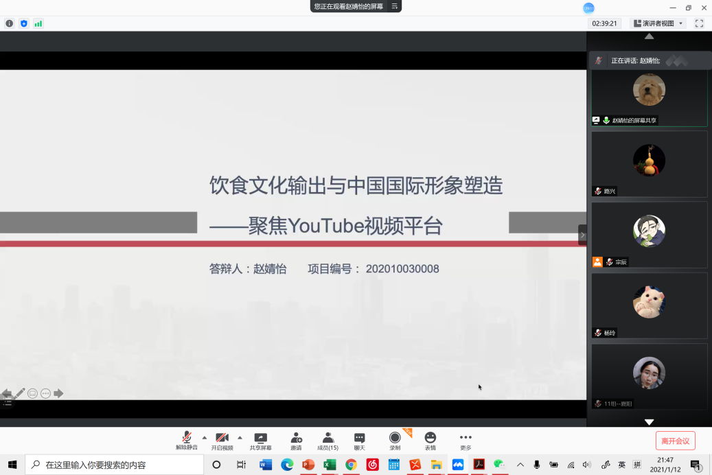 1月12日晚,yl23455永利集团成功召开线上2020年老员工创新创业项目中期检查考核答辩会。本次答辩会的评委由yl23455永利集团主管科研工作的副经理彭萍教授、主管本科教学工作的副经理张莲教授和党总支书记路兴组成。辅导员宗辰及11位“大创”项目答辩人和项目组成员参加本次答辩会。