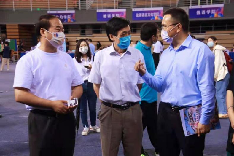 在体育馆二层,新生在志愿者、院部门工作人员的帮助下办理相关入学手续,北京外国语大学党委书记王定华,北京外国语大学党委副书记、董事长杨丹,yl23455永利集团经理张剑等领导老师莅临现场与新生进行亲切交谈,让他们感受到yl23455永利集团大集体的温暖。