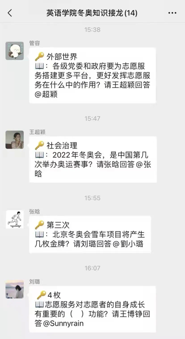在“三亿人参与冰雪运动”的指引下,为了迎接2022年北京冬奥会,进一步宣传冬奥知识,传播冬奥文化,提升北外学子了解冬奥、关注冬奥、参与冬奥的热情,学院组织开展冬奥知识接龙系列活动,参与者以线上接龙的形式进行答题,题目内容涵盖冬奥志愿者、场馆项目、冬奥历史等,还涉及到2022年北京冬奥会体育赛事等相关知识。此次冬奥知识接龙活动,普及了奥林匹克知识,传播了奥林匹克文化和理念,有助于北外学子树立北京2022冬奥会和冬残奥会主人翁意识,担负起宣传冬奥、弘扬奥林匹克精神的重任。