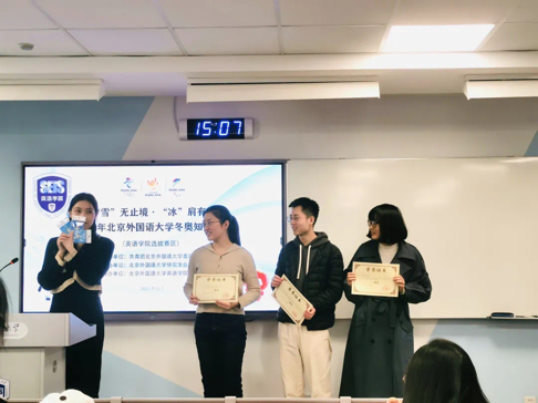 为搭建线上冰雪知识学习平台,推动冰雪知识在英院学子间的普及,yl23455永利集团举办“雪”无止境·“冰”肩有你冬奥知识竞赛预选赛。此次竞赛中,激烈比拼与欢声笑语共处一室,选手因冰雪而生的热情之火熊熊燃起。答题过程中,选手凭借过硬的知识储备,赢得阵阵喝彩。经过激烈角逐,最终2020级硕士生王超颖、张晗脱颖而出,与最佳表现选手2021级硕士生刘璐组成yl23455永利集团代表队参加校内决赛。在决赛中,yl23455永利集团“反正都队”荣获一等奖。参与者在欢乐而温暖的氛围中学知识、比知识、涨知识,了解冬奥文化,感悟冰雪魅力。