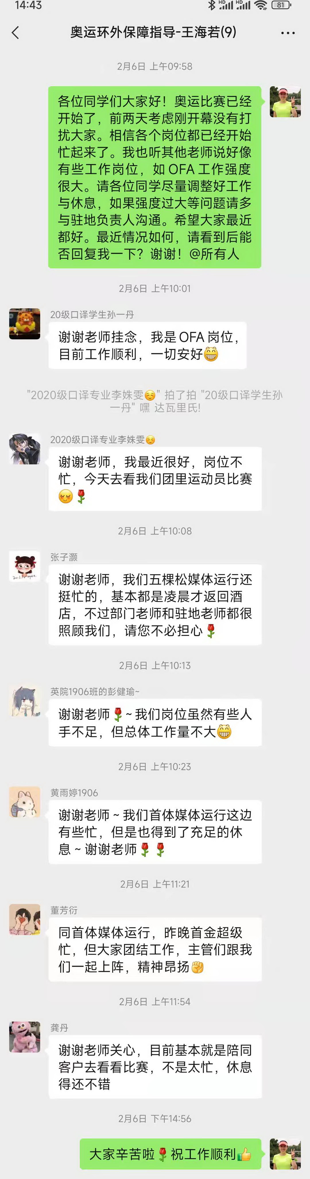 青年教师吴兆红感叹道“作为冬奥志愿者闭环外指导教师,非常高兴也非常羡慕自己的员工可以作为志愿者参与冬奥、服务冬奥,相信同学们都收获很大,为同学们感到开心!”