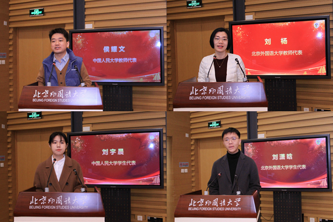 中国人民大学教师侯耀文、北京外国语大学教师刘杨先后作为教师代表发言。侯耀文表示,将进一步以扎实的学科素养、宏大的国际视野和世界情怀投入教学科研,为培养21世纪马克思主义国际传播人才、推动21世纪马克思主义走出去做出贡献。刘杨指出,要从全面立体的视角去看待所学语言,透过双方的语言了解两者之间的文化差异。在充分理解中国故事、中国理论的基础上,以对方听得懂的讲述方式,把中国的声音讲到对方心里。