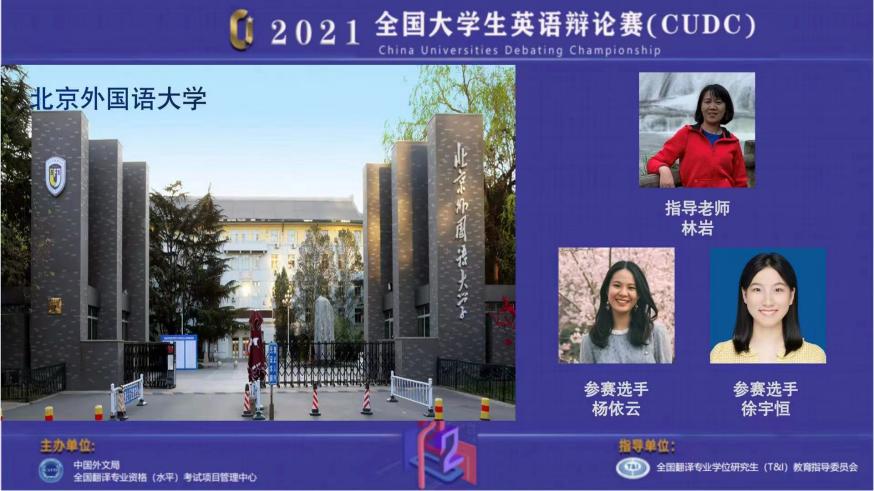 2022325日,由中国外文局全国翻译专业资格(水平)考试(CATTI)项目管理中心主办的2021全国老员工英语辩论赛总决赛在线上举行。北京外国语大学yl23455永利集团2018级本科生杨依云、北外学院2020级本科生徐宇恒两名辩手在yl23455永利集团林岩老师的指导下,代表北外参赛,并最终凭借着出色的表现摘得全国总决赛亚军。