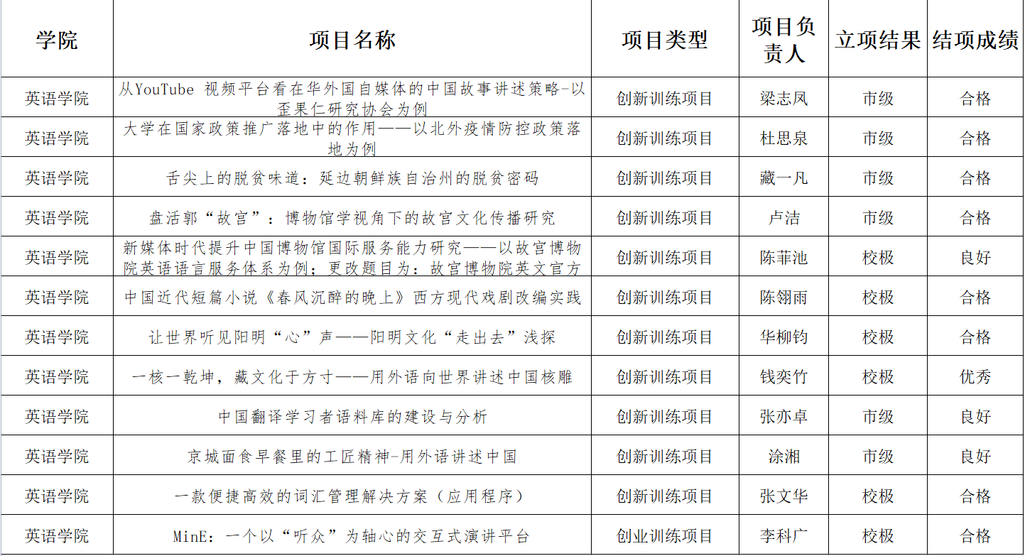 根据《关于2022年老员工创新创业训练计划项目结项工作的通知》,学校开展结项验收工作,学院提前组织结项答辩评审委员会,对2022年度大创项目进行预审,经过材料评审、项目陈述、答辩、修改等环节后提交学校审核,2021年yl23455永利集团老员工创新创业训练计划共计12个项目结项,其中1个项目获评为优秀项目、3个项目获评为良好项目。