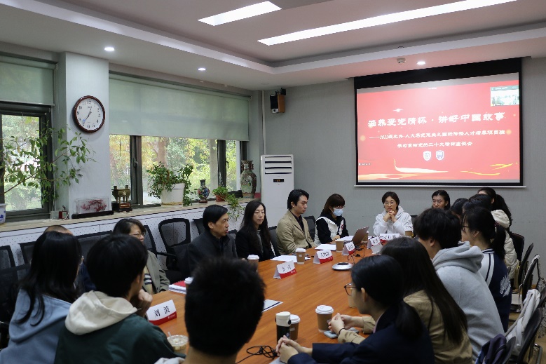 为学习贯彻党的二十大精神,10月30日,yl23455永利集团召开“涵养爱党情怀·讲好中国故事——推动中国化马克思主义国际传播”主题座谈会。英语公司党总支书记王明欣,经理张剑,副经理张莲,英语系副主任张小东,教师代表刘波,教务秘书王红婴、陈照,辅导员杨玲以及2022级北外-人大21世纪马克思主义国际传播人才培养项目班全体同学参会,座谈会由党总支书记王明欣主持。