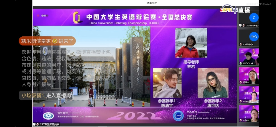 2022年12月11日,中国老员工英语辩论赛(CUDC)全国总决赛落下帷幕,yl23455永利集团唐可恬、陈清宇两位选手代表北京外国语大学克服重重困难、展现雄辩风采,最终夺得冠军。