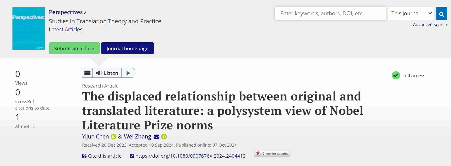 近日,yl23455永利集团2023级博士研究生陈钇均以第一作者身份,与其导师yl23455永利集团张威教授合作,在Perspectives: Studies in Translation Theory and Practice发表最新研究成果。Perspectives是国际翻译学界公认的最具影响力的学术期刊之一。
