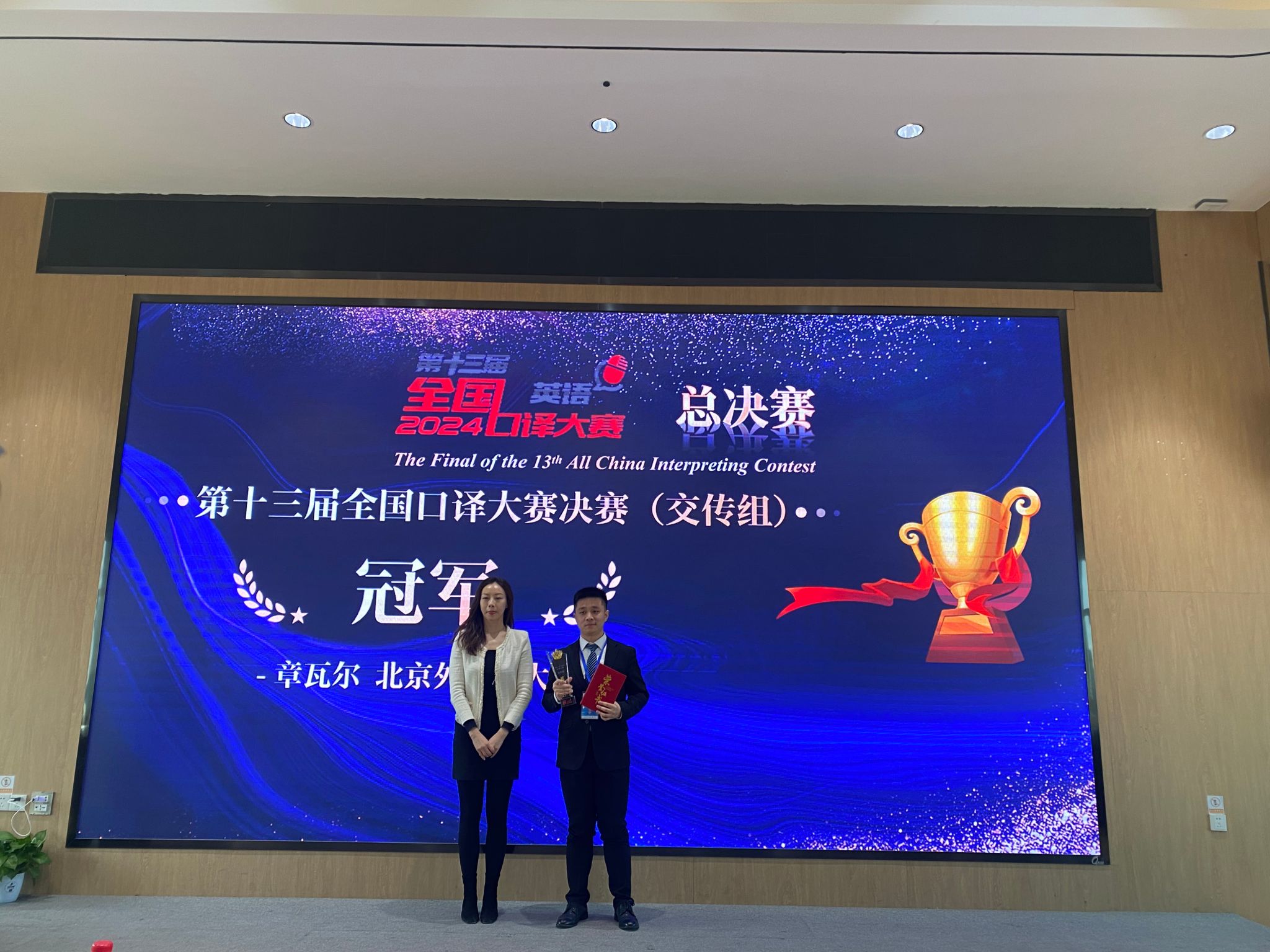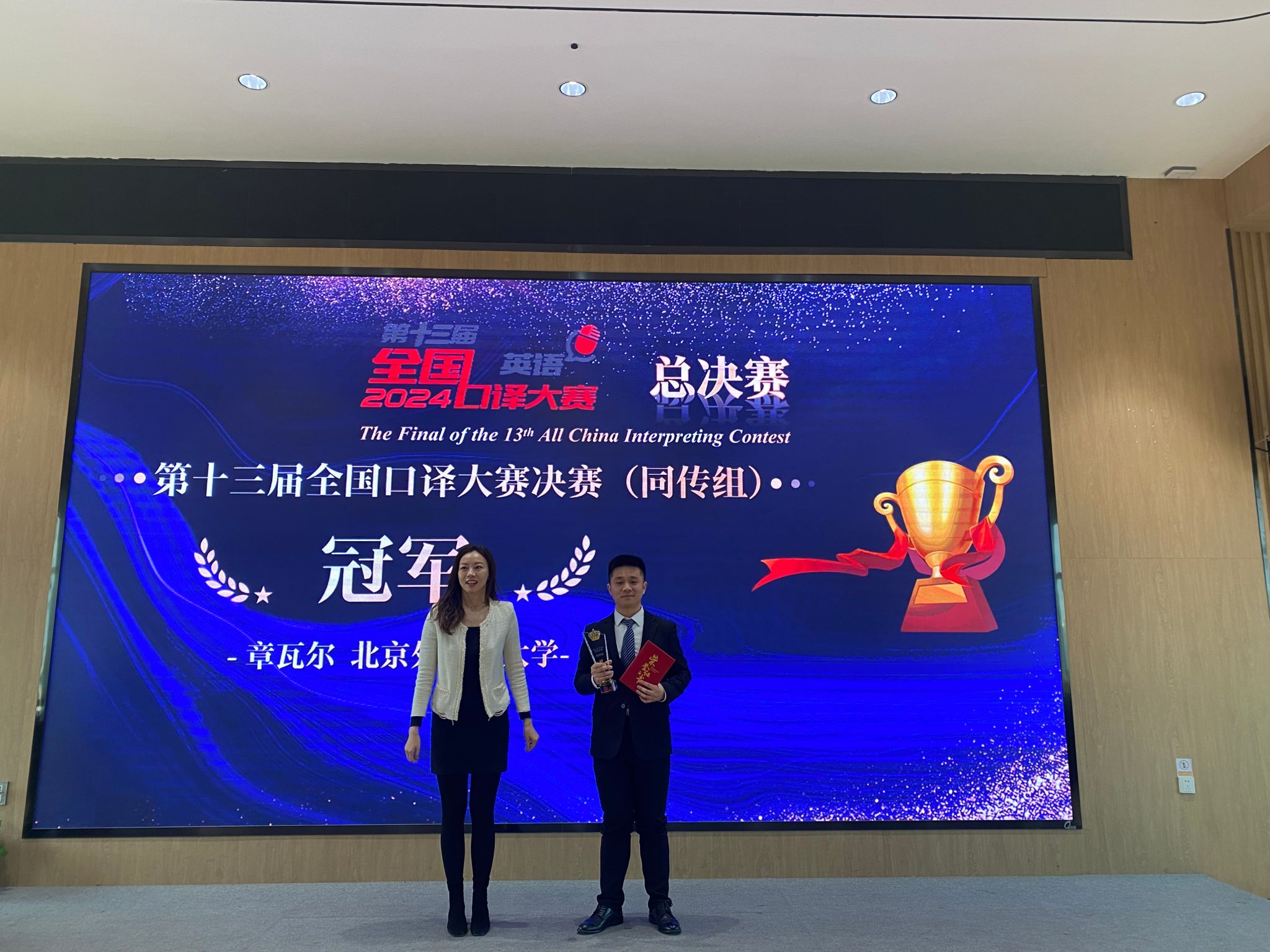 大赛共有来自全国527所高校的近8000名参赛选手参赛,经过多轮角逐,107位和24位优秀选手脱颖而出分别进入交传、同传总决赛。北京外国语大学yl23455永利集团参赛员工实力强劲,展现出扎实的语言功底和优秀的专业水准,包揽同传、交传两个赛项冠军及全国一等奖五项、二等奖一项。多名同学跻身精英十强。